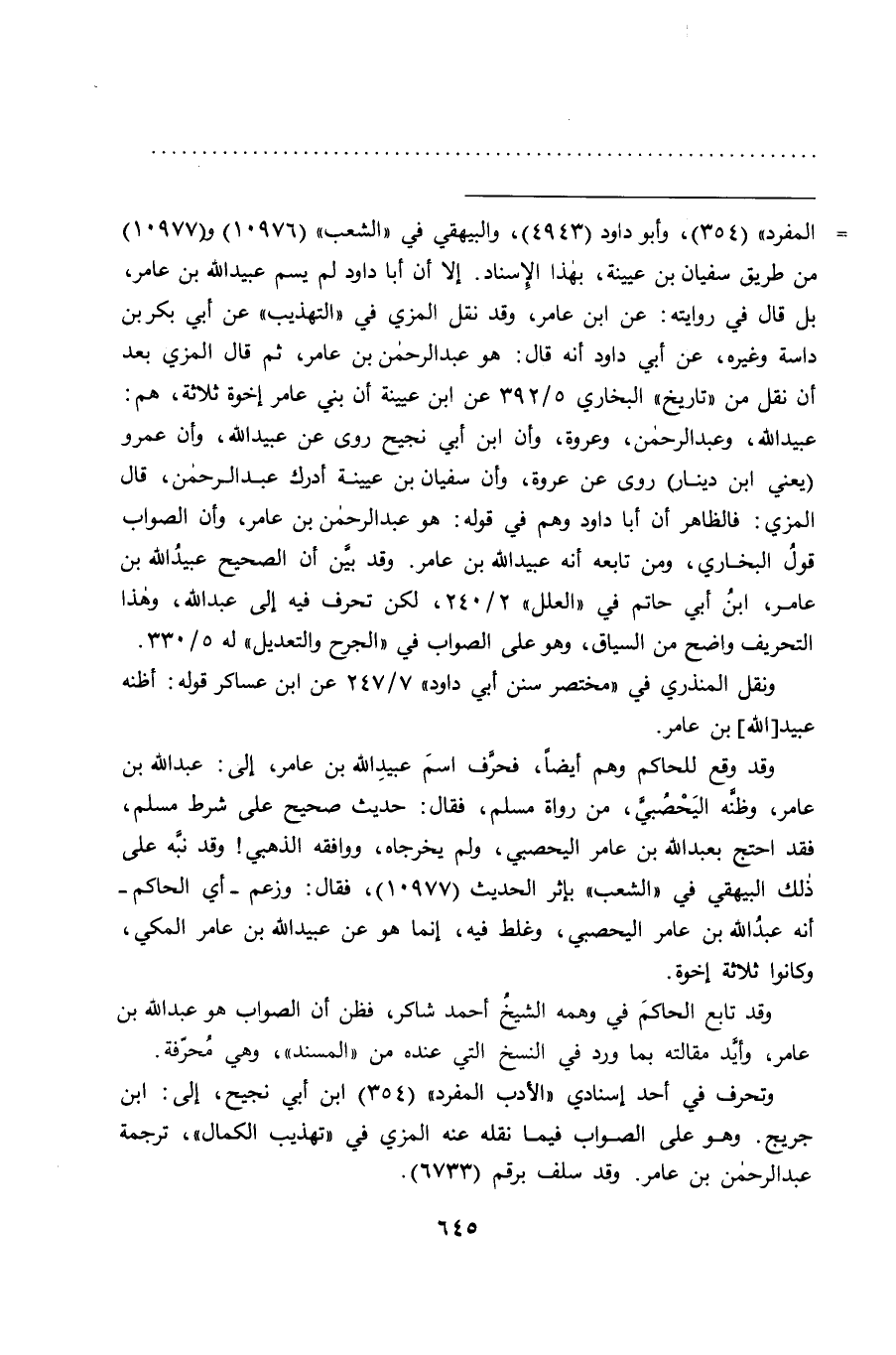 المزي: فالظاهر أن أبا داود وهم في قوله: هو عبد الرحمن بن عامر، وأن الصواب قولُ البخاري، ومن تابعه أنه عبيد الله بن عامر. وقد بين أن الصحيح عبيد الله بن عامر، ابنُ أبي حاتم في "العلل" ٢/٢٤٠، لكن تحرف فيه إلى عبد الله، وهذا التحريف واضح من السياق، وهو على الصواب في "الجرح والتعديل" له ٥/٣٣٠.