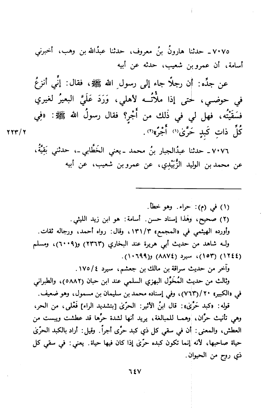 ٧٠٧٥ - حَدَّثَنَا هَارُونُ بْنُ مَعْرُوفٍ، حَدَّثَنَا عَبْدُ اللهِ بْنُ وَهْبٍ، أَخْبَرَنِي أُسَامَةُ، أَنَّ عَمْرَو بْنَ شُعَيْبٍ، حَدَّثَهُ، عَنْ أَبِيهِ، عَنْ جَدِّهِ، أَنَّ رَجُلًا جَاءَ إِلَى رَسُولِ اللهِ صَلَّى اللهُ عَلَيْهِ وَسَلَّمَ، فَقَالَ: إِنِّي أَنْزِعُ فِي حَوْضِي، حَتَّى إِذَا مَلَأْتُهُ لِأَهْلِي، وَرَدَ عَلَيَّ الْبَعِيرُ لِغَيْرِي فَسَقَيْتُهُ، فَهَلْ لِي فِي ذَلِكَ مِنْ أَجْرٍ؟ فَقَالَ رَسُولُ اللهِ صَلَّى اللهُ عَلَيْهِ وَسَلَّمَ: " فِي كُلِّ ذَاتِ كَبِدٍ حَرَّى (١) أَجْرٌ " (٢)