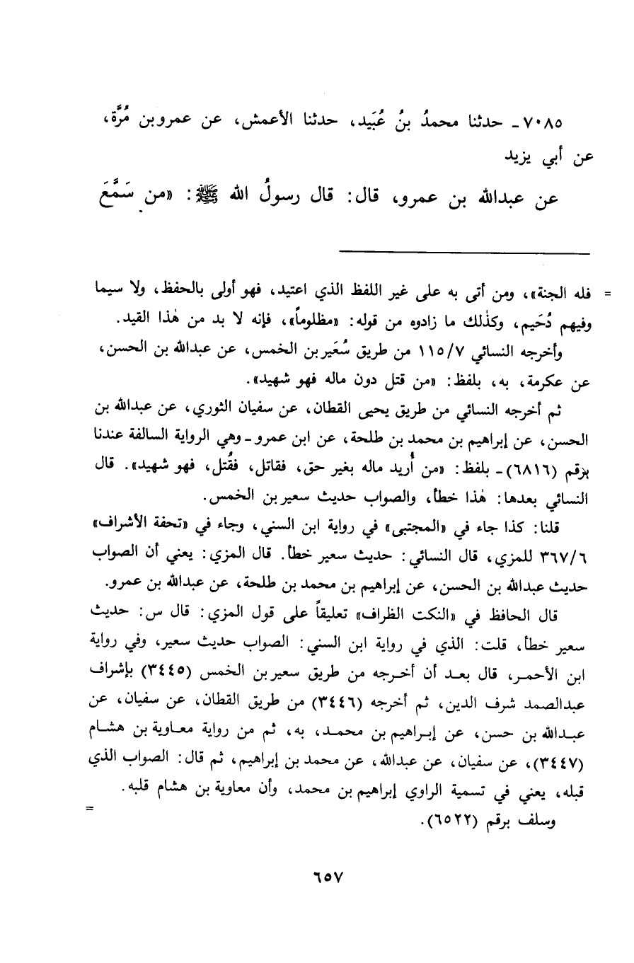 ثم أخرجه النسائي من طريق يحيى القطان، عن سفيان الثوري، عن عبد الله بن الحسن، عن إبراهيم بن محمد بن طلحة، عن ابن عمرو -وهي الرواية السالفة عندنا برقم (٦٨٦١) - بلفظ: "من أريد ماله بغير حق، فقاتل، فقُتل، فهو شهيد". قال النسائي بعدها: هذا خطأ، والصواب حديث سعير بن الخمس.