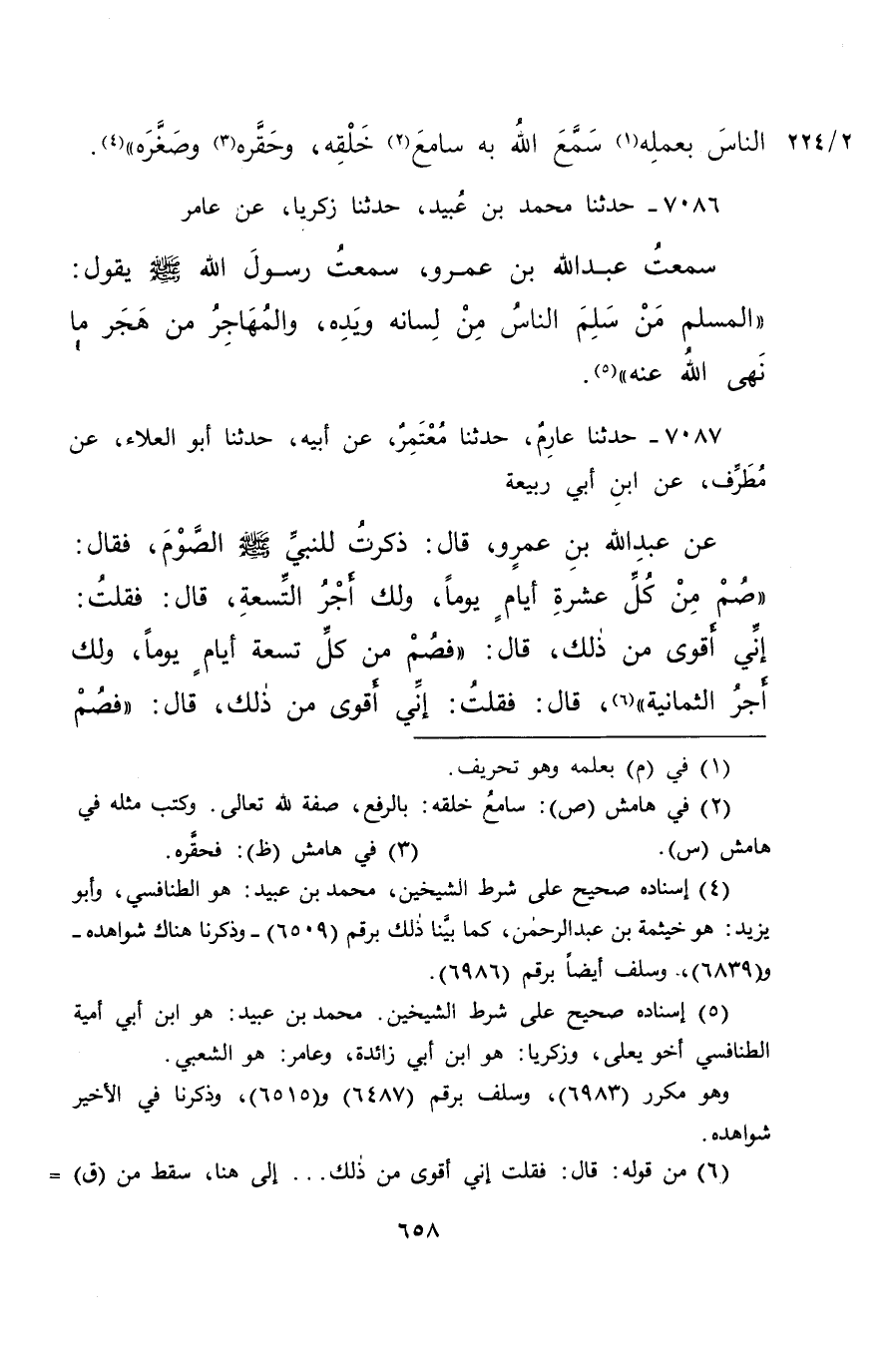 ٧٠٨٦ - حَدَّثَنَا مُحَمَّدُ بْنُ عُبَيْدٍ، حَدَّثَنَا زَكَرِيَّا، عَنْ عَامِرٍ، سَمِعْتُ عَبْدَ اللهِ بْنَ عَمْرٍو، سَمِعْتُ رَسُولَ اللهِ صَلَّى اللهُ عَلَيْهِ وَسَلَّمَ يَقُولُ: " الْمُسْلِمُ مَنْ سَلِمَ النَّاسُ مِنْ لِسَانِهِ وَيَدِهِ، وَالْمُهَاجِرُ مَنْ هَجَرَ مَا نَهَى الله عَنْهُ " (٥)