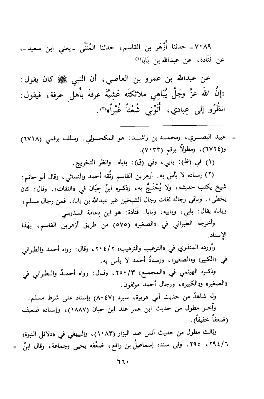 ٧٠٨٩ - حَدَّثَنَا أَزْهَرُ بْنُ الْقَاسِمِ، حَدَّثَنَا الْمُثَنَّى يَعْنِي ابْنَ سَعِيدٍ، عَنْ قَتَادَةَ، عَنْ عَبْدِ اللهِ بْنِ بَابَا (١) ، عَنْ عَبْدِ اللهِ بْنِ عَمْرِو بْنِ الْعَاصِي، أَنَّ النَّبِيَّ صَلَّى اللهُ عَلَيْهِ وَسَلَّمَ كَانَ يَقُولُ: " إِنَّ اللهَ عَزَّ وَجَلَّ يُبَاهِي مَلَائِكَتَهُ عَشِيَّةَ عَرَفَةَ بِأَهْلِ عَرَفَةَ، فَيَقُولُ: انْظُرُوا إِلَى عِبَادِي أَتَوْنِي شُعْثًا غُبْرًا " (٢)