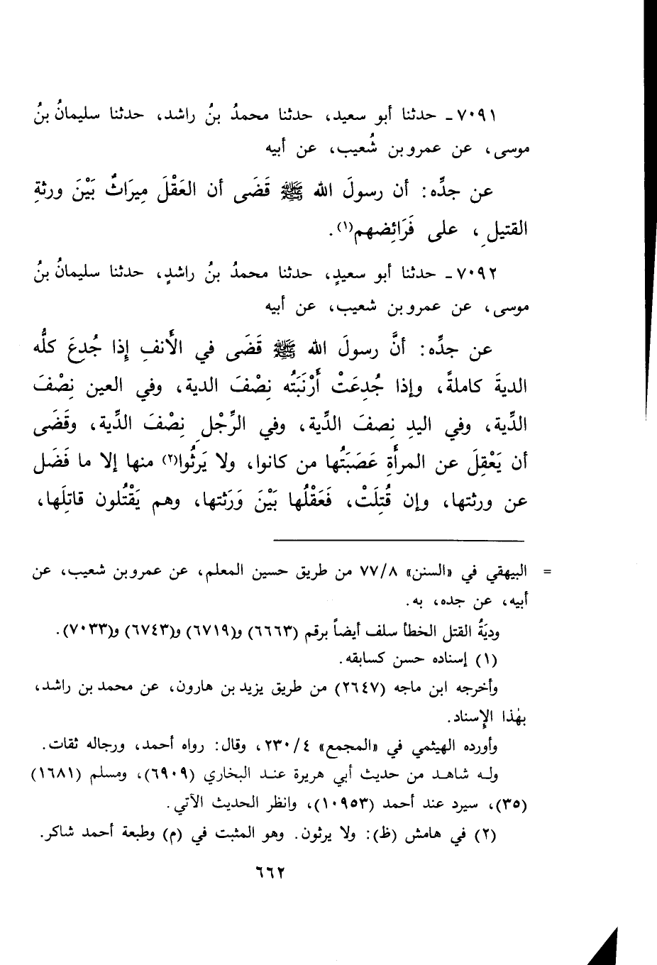 ٧٠٩٢ - حَدَّثَنَا أَبُو سَعِيدٍ، حَدَّثَنَا مُحَمَّدُ بْنُ رَاشِدٍ، حَدَّثَنَا سُلَيْمَانُ بْنُ مُوسَى، عَنْ عَمْرِو بْنِ شُعَيْبٍ، عَنْ أَبِيهِ، عَنْ جَدِّهِ، أَنَّ رَسُولَ اللهِ صَلَّى اللهُ عَلَيْهِ وَسَلَّمَ " قَضَى فِي الْأَنْفِ إِذَا جُدِعَ كُلُّهُ الدِّيَةَ كَامِلَةً، وَإِذَا جُدِعَتْ أَرْنَبَتُهُ نِصْفَ الدِّيَةِ، وَفِي الْعَيْنِ نِصْفَ الدِّيَةِ، وَفِي الْيَدِ نِصْفَ الدِّيَةِ، وَفِي الرِّجْلِ نِصْفَ الدِّيَةِ، وَقَضَى أَنْ يَعْقِلَ عَنِ الْمَرْأَةِ عَصَبَتُهَا مَنْ كَانُوا، وَلَا يَرِثُوا (٢) مِنْهَا إِلَّا مَا فَضَلَ عَنْ وَرَثَتِهَا، وَإِنْ قُتِلَتْ، فَعَقْلُهَا بَيْنَ وَرَثَتِهَا، وَهُمْ يَقْتُلُونَ قَاتِلَهَا،