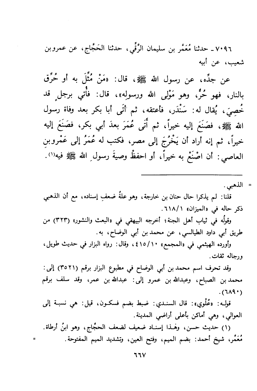 ٧٠٩٦ - حَدَّثَنَا مَعْمَرُ بْنُ سُلَيْمَانَ الرَّقِّيُّ، حَدَّثَنَا الْحَجَّاجُ، عَنْ عَمْرِو بْنِ شُعَيْبٍ، عَنْ أَبِيهِ، عَنْ جَدِّهِ، عَنْ رَسُولِ اللهِ صَلَّى اللهُ عَلَيْهِ وَسَلَّمَ، قَالَ: " مَنْ مُثِّلَ بِهِ أَوْ حُرِّقَ بِالنَّارِ، فَهُوَ حُرٌّ، وَهُوَ مَوْلَى اللهِ وَرَسُولِهِ "، قَالَ: فَأُتِيَ بِرَجُلٍ قَدْ خُصِيَ، يُقَالُ لَهُ: سَنْدَرٌ، فَأَعْتَقَهُ " ثُمَّ أَتَى أَبَا بَكْرٍ، بَعْدَ وَفَاةِ رَسُولِ اللهِ صَلَّى اللهُ عَلَيْهِ وَسَلَّمَ، فَصَنَعَ إِلَيْهِ خَيْرًا " " ثُمَّ أَتَى عُمَرَ، بَعْدَ أَبِي بَكْرٍ، فَصَنَعَ إِلَيْهِ خَيْرًا، ثُمَّ إِنَّهُ أَرَادَ أَنْ يَخْرُجَ إِلَى مِصْرَ، فَكَتَبَ لَهُ عُمَرُ إِلَى عَمْرِو بْنِ الْعَاصِي: أَنِ اصْنَعْ بِهِ خَيْرًا، أَوِ احْفَظْ وَصِيَّةَ رَسُولِ اللهِ صَلَّى اللهُ عَلَيْهِ وَسَلَّمَ فِيهِ " (١)
