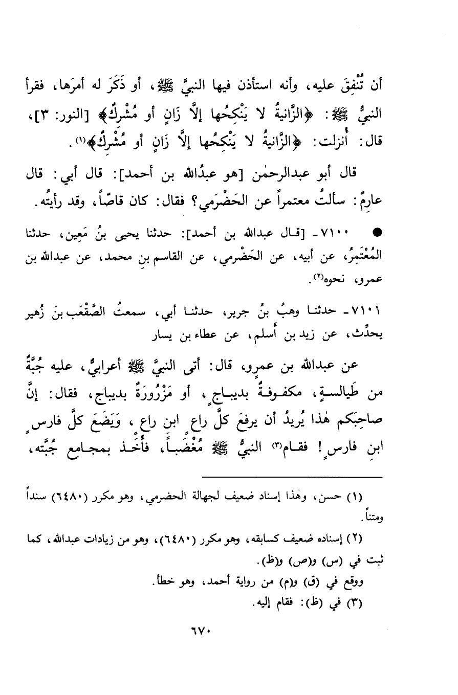أَنْ تُنْفِقَ عَلَيْهِ، وَأَنَّهُ اسْتَأْذَنَ فِيهَا النَّبِيَّ صَلَّى اللهُ عَلَيْهِ وَسَلَّمَ، أَوْ ذَكَرَ لَهُ أَمْرَهَا " فَقَرَأَ النَّبِيُّ صَلَّى اللهُ عَلَيْهِ وَسَلَّمَ: {الزَّانِيَةُ لَا يَنْكِحُهَا إِلَّا زَانٍ أَوْ مُشْرِكٌ} [النور: ٣] "، قَالَ: أُنْزِلَتْ {الزَّانِيَةُ لَا يَنْكِحُهَا إِلَّا زَانٍ أَوْ مُشْرِكٌ} [النور: ٣] (١) ، قَالَ أَبُو عَبْدِ الرَّحْمَنِ [هُوَ عَبْدُ اللهِ بْنُ أَحْمَدَ] قَالَ أَبِي: قَالَ عَارِمٌ: سَأَلْتُ مُعْتَمِرًا، عَنِ الْحَضْرَمِيِّ؟ فَقَالَ: " كَانَ قَاصًّا، وَقَدْ رَأَيْتُهُ "