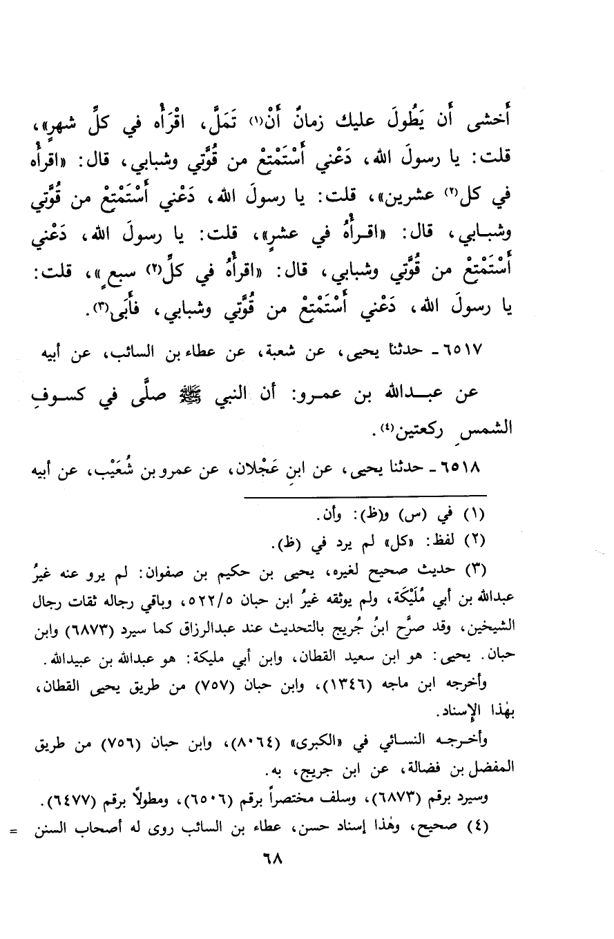 أَخْشَى أَنْ يَطُولَ عَلَيْكَ زَمَانٌ أَنْ (١) تَمَلَّ اقْرَأْهُ فِي كُلِّ شَهْرٍ "، قُلْتُ: يَا رَسُولَ اللهِ، دَعْنِي أَسْتَمْتِعْ مِنْ قُوَّتِي وَشَبَابِي، قَالَ: " اقْرَأْهُ فِي كُلِّ عِشْرِينَ "، قُلْتُ: يَا رَسُولَ اللهِ، دَعْنِي أَسْتَمْتِعْ مِنْ قُوَّتِي وَشَبَابِي، قَالَ: " اقْرَأْهُ فِي عَشْرٍ "، قُلْتُ: يَا رَسُولَ اللهِ، دَعْنِي أَسْتَمْتِعْ مِنْ قُوَّتِي وَشَبَابِي، قَالَ: " اقْرَأْهُ فِي كُلِّ (٢) سَبْعٍ "، قُلْتُ: يَا رَسُولَ اللهِ، دَعْنِي أَسْتَمْتِعْ مِنْ قُوَّتِي وَشَبَابِي، فَأَبَى (٣)