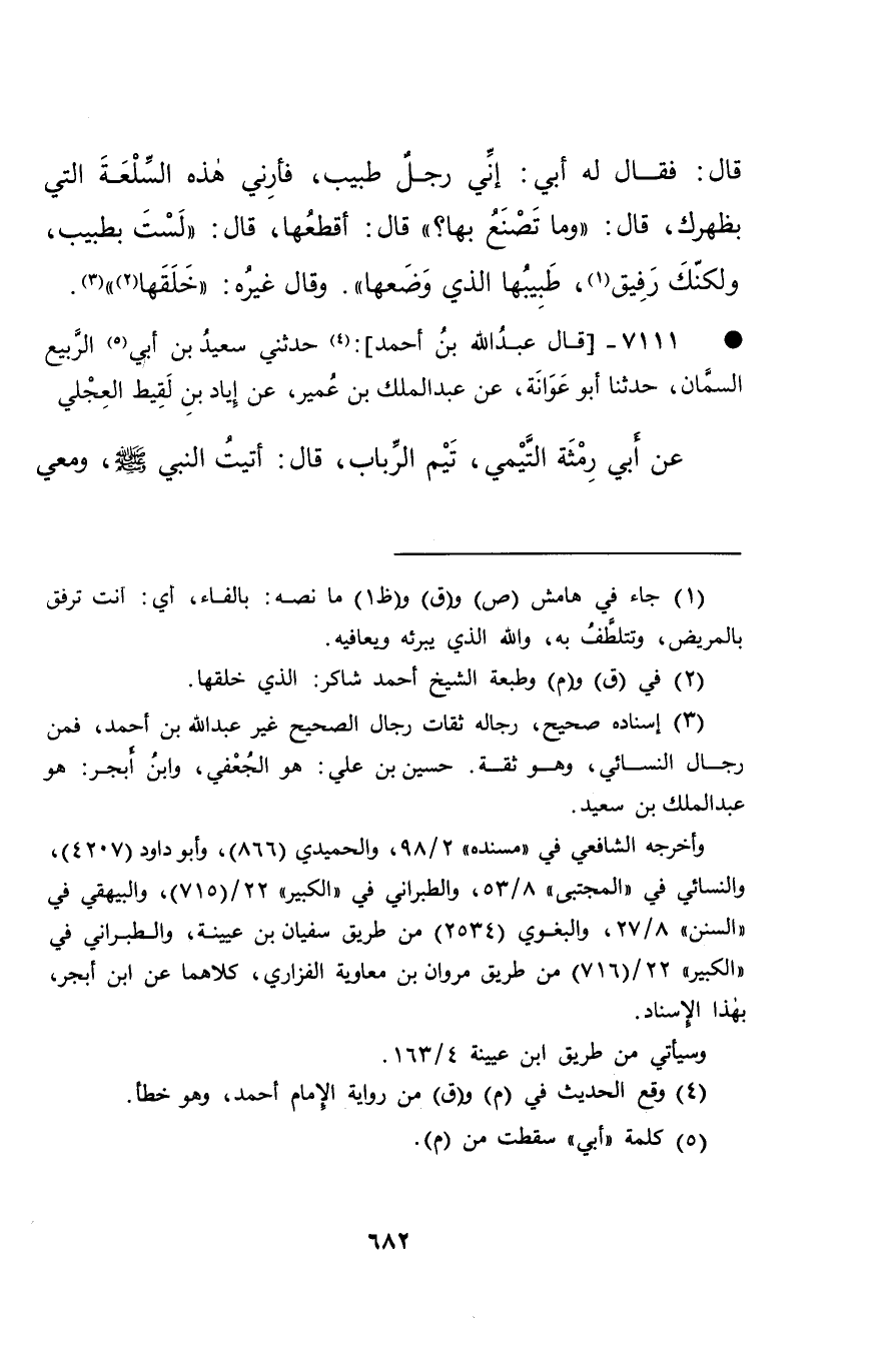 قَالَ: فَقَالَ لَهُ أَبِي: إِنِّي رَجُلٌ طَبِيبٌ، فَأَرِنِي هَذِهِ السِّلْعَةَ الَّتِي بِظَهْرِكَ، قَالَ: " وَمَا تَصْنَعُ بِهَا؟ " قَالَ: أَقْطَعُهَا، قَالَ: " لَسْتَ بِطَبِيبٍ، وَلَكِنَّكَ رَفِيقٌ (١) ، طَبِيبُهَا الَّذِي وَضَعَهَا " وَقَالَ غَيْرُهُ: " خَلَقَهَا (٢) " (٣)