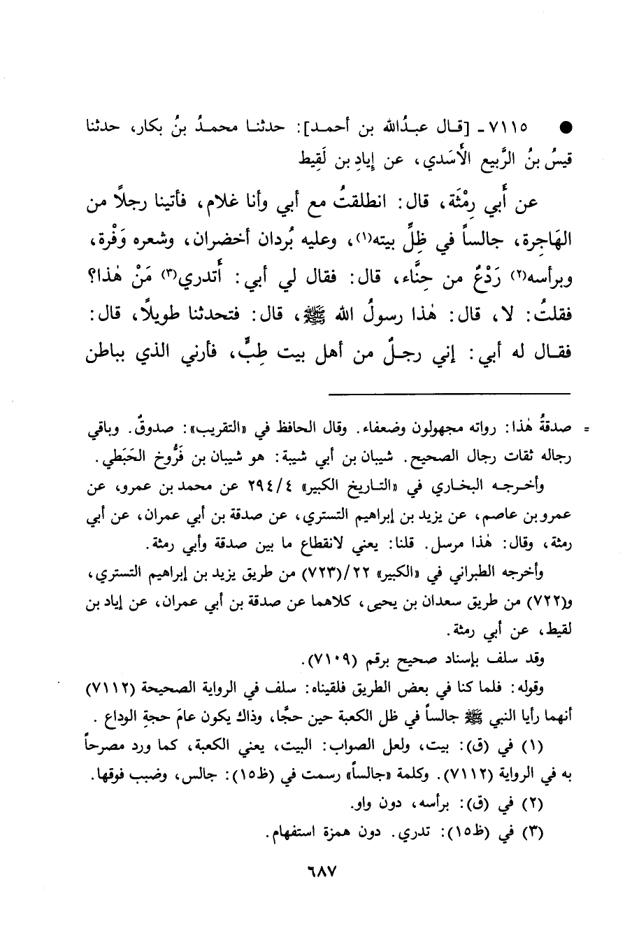 • ٧١١٥ -[قَالَ عَبْدُ اللهِ بْنُ أَحْمَدَ] : حَدَّثَنَا مُحَمَّدُ بْنُ بَكَّارٍ، حَدَّثَنَا قَيْسُ بْنُ الرَّبِيعِ الْأَسَدِيُّ، عَنْ إِيَادِ بْنِ لَقِيطٍ، عَنْ أَبِي رِمْثَةَ، قَالَ: انْطَلَقْتُ مَعَ أَبِي وَأَنَا غُلَامٌ، فَأَتَيْنَا رَجُلًا مِنَ الْهَاجِرَةِ، جَالِسًا فِي ظِلِّ بَيْتِهِ (١) وَعَلَيْهِ بُرْدَانِ أَخْضَرَانِ، وَشَعْرُهُ وَفْرَةٌ، وَبِرَأْسِهِ (٢) رَدْعٌ مِنْ حِنَّاءٍ، قَالَ: فَقَالَ لِي أَبِي: أَتَدْرِي (٣) مَنْ هَذَا؟ فَقُلْتُ: لَا، قَالَ: هَذَا رَسُولُ اللهِ صَلَّى اللهُ عَلَيْهِ وَسَلَّمَ، قَالَ: فَتَحَدَّثْنَا طَوِيلًا، قَالَ: فَقَالَ لَهُ أَبِي: إِنِّي رَجُلٌ مِنْ أَهْلِ بَيْتِ طِبٍّ، فَأَرِنِي الَّذِي بِبَاطِنِ