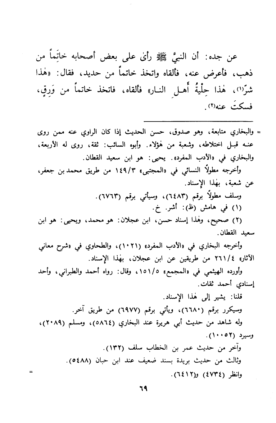 عَنْ جَدِّهِ: أَنَّ النَّبِيَّ صَلَّى اللهُ عَلَيْهِ وَسَلَّمَ رَأَى عَلَى بَعْضِ أَصْحَابِهِ خَاتَمًا مِنْ ذَهَبٍ، فَأَعْرَضَ عَنْهُ، فَأَلْقَاهُ وَاتَّخَذَ خَاتَمًا مِنْ حَدِيدٍ، فَقَالَ: " هَذَا شَرٌّ (١) ، هَذَا حِلْيَةُ أَهْلِ النَّارِ "، فَأَلْقَاهُ، فَاتَّخَذَ خَاتَمًا مِنْ وَرِقٍ، فَسَكَتَ عَنْهُ (٢)