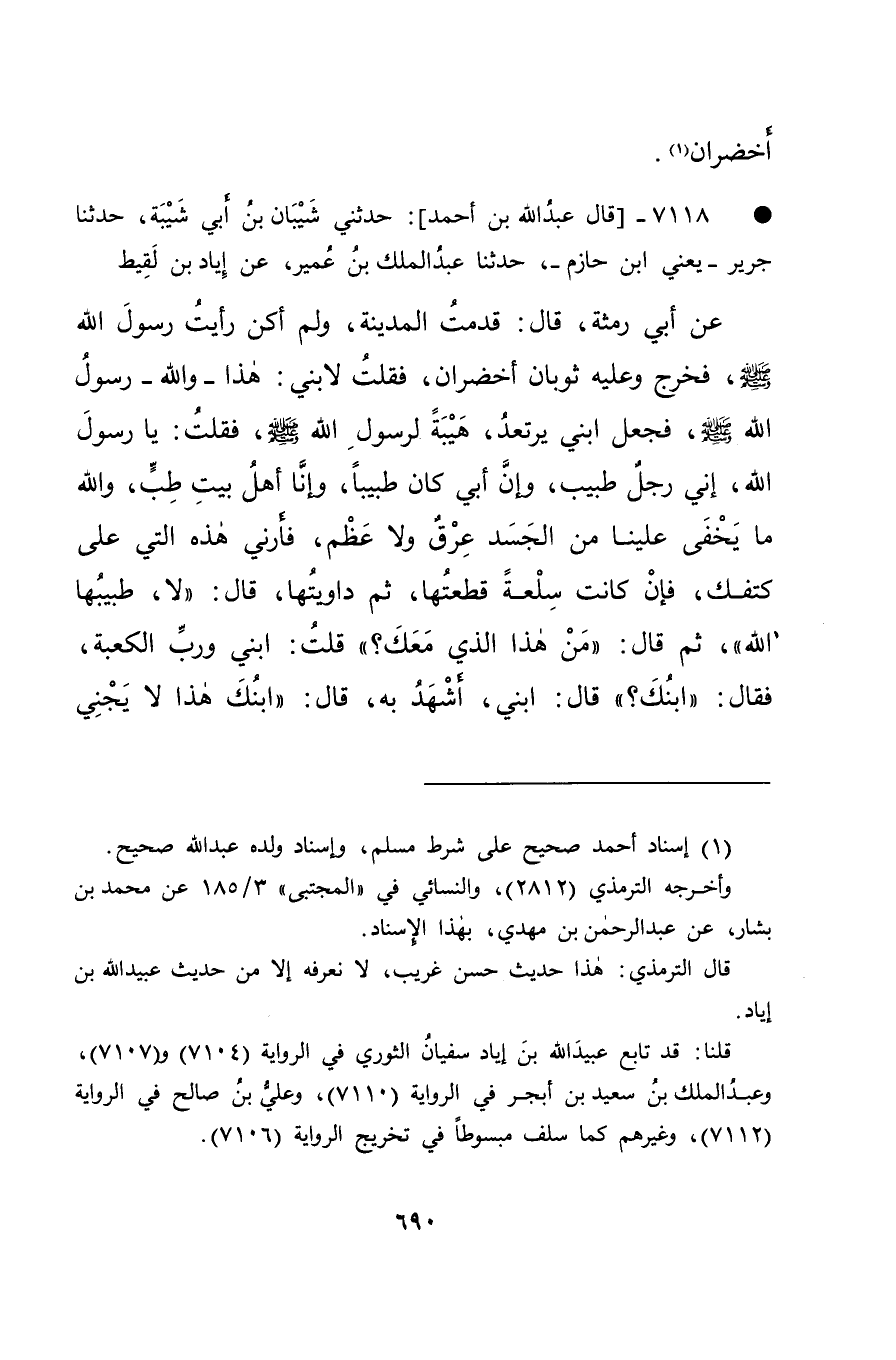• ٧١١٨ -[قَالَ عَبْدُ اللهِ بْنُ أَحْمَدَ] : حَدَّثَنِي شَيْبَانُ بْنُ أَبِي شَيْبَةَ، حَدَّثَنَا جَرِيرٌ يَعْنِي ابْنَ حَازِمٍ، حَدَّثَنَا عَبْدُ الْمَلِكِ بْنُ عُمَيْرٍ، عَنْ إِيَادِ بْنِ لَقِيطٍ، عَنْ أَبِي رِمْثَةَ، قَالَ: قَدِمْتُ الْمَدِينَةَ، وَلَمْ أَكُنْ رَأَيْتُ رَسُولَ اللهِ صَلَّى اللهُ عَلَيْهِ وَسَلَّمَ، فَخَرَجَ وَعَلَيْهِ ثَوْبَانِ أَخْضَرَانِ، فَقُلْتُ لِابْنِي: هَذَا وَاللهِ رَسُولُ اللهِ صَلَّى اللهُ عَلَيْهِ وَسَلَّمَ، فَجَعَلَ ابْنِي يَرْتَعِدُ، هَيْبَةً لِرَسُولِ اللهِ صَلَّى اللهُ عَلَيْهِ وَسَلَّمَ، فَقُلْتُ: يَا رَسُولَ اللهِ، إِنِّي رَجُلٌ طَبِيبٌ، وَإِنَّ أَبِي كَانَ طَبِيبًا، وَإِنَّا أَهْلُ بَيْتِ طِبٍّ، وَاللهِ مَا يَخْفَى عَلَيْنَا مِنَ الْجَسَدِ عِرْقٌ وَلَا عَظْمٌ، فَأَرِنِي هَذِهِ الَّتِي عَلَى كَتِفِكَ، فَإِنْ كَانَتْ سِلْعَةً قَطَعْتُهَا، ثُمَّ دَاوَيْتُهَا، قَالَ: " لَا، طَبِيبُهَا اللهُ "، ثُمَّ قَالَ: " مَنْ هَذَا الَّذِي مَعَكَ؟ " قُلْتُ: ابْنِي وَرَبِّ الْكَعْبَةِ، فَقَالَ: " ابْنُكَ؟ " قَالَ: ابْنِي، أَشْهَدُ بِهِ، قَالَ: " ابْنُكَ هَذَا لَا يَجْنِي