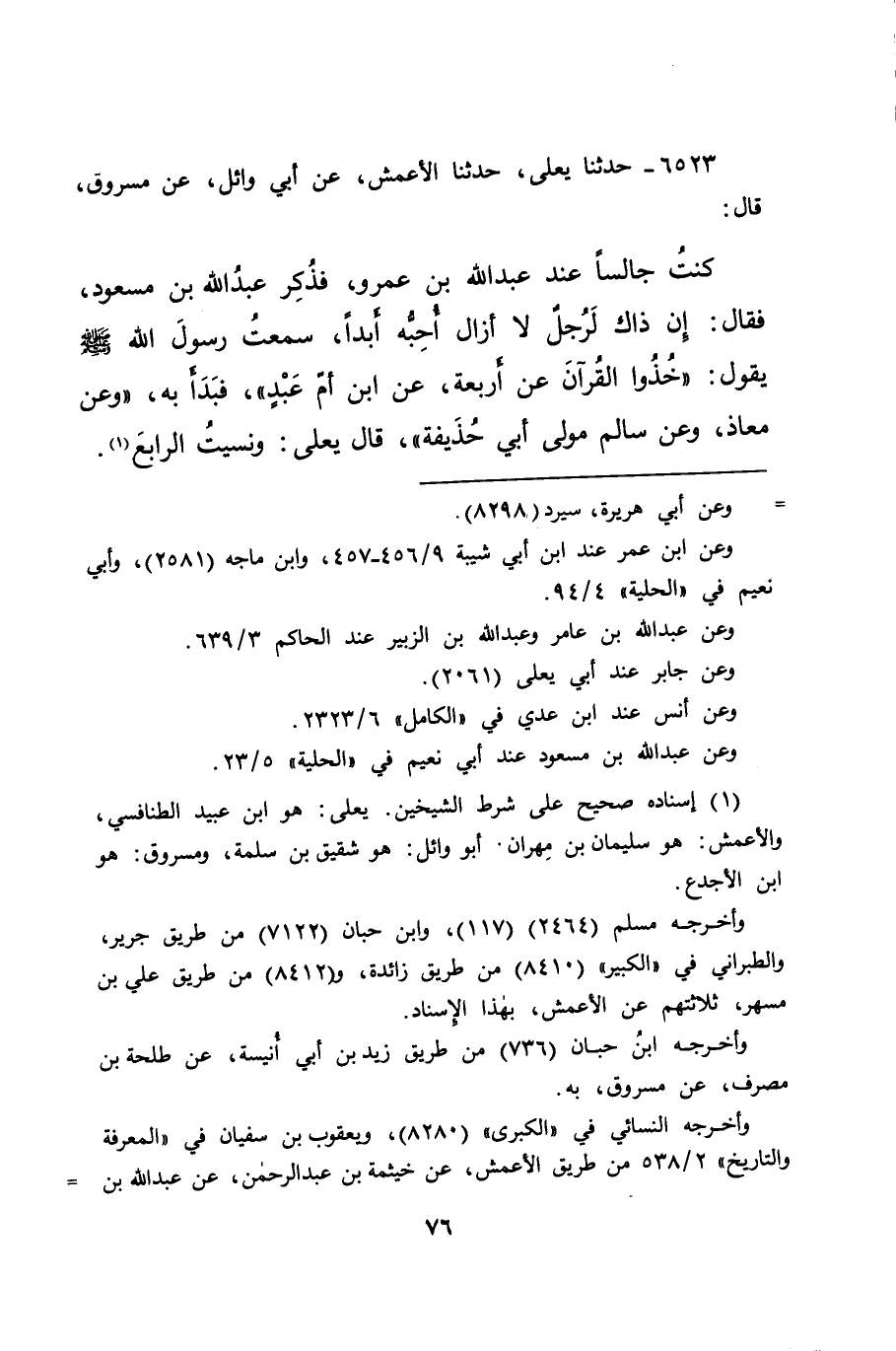 ٦٥٢٣ - حَدَّثَنَا يَعْلَى، حَدَّثَنَا الْأَعْمَشُ، عَنْ أَبِي وَائِلٍ، عَنْ مَسْرُوقٍ، قَالَ: كُنْتُ جَالِسًا عِنْدَ عَبْدِ اللهِ بْنِ عَمْرٍو فَذُكِرَ عَبْدُ اللهِ بْنُ مَسْعُودٍ، فَقَالَ: إِنَّ ذَاكَ لَرَجُلٌ لَا أَزَالُ أُحِبُّهُ أَبَدًا، سَمِعْتُ رَسُولَ اللهِ صَلَّى اللهُ عَلَيْهِ وَسَلَّمَ يَقُولُ: " خُذُوا الْقُرْآنَ عَنْ أَرْبَعَةٍ، عَنِ ابْنِ أُمِّ عَبْدٍ " فَبَدَأَ بِهِ، " وَعَنْ مُعَاذٍ، وَعَنْ سَالِمٍ مَوْلَى أَبِي حُذَيْفَةَ " قَالَ يَعْلَى: وَنَسِيتُ الرَّابِعَ (١)