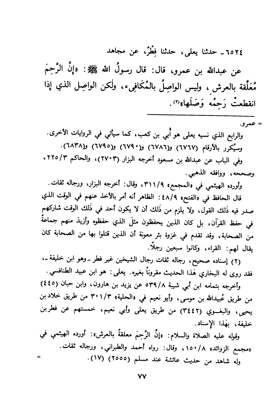 ٦٥٢٤ - حَدَّثَنَا يَعْلَى، حَدَّثَنَا فِطْرٌ، عَنْ مُجَاهِدٍ، عَنْ عَبْدِ اللهِ بْنِ عَمْرٍو، قَالَ: قَالَ رَسُولُ اللهِ صَلَّى اللهُ عَلَيْهِ وَسَلَّمَ: " إِنَّ الرَّحِمَ مُعَلَّقَةٌ بِالْعَرْشِ، وَلَيْسَ الْوَاصِلُ بِالْمُكَافِئِ، وَلَكِنَّ الْوَاصِلَ الَّذِي إِذَا انْقَطَعَتْ رَحِمُهُ وَصَلَهَا " (١)