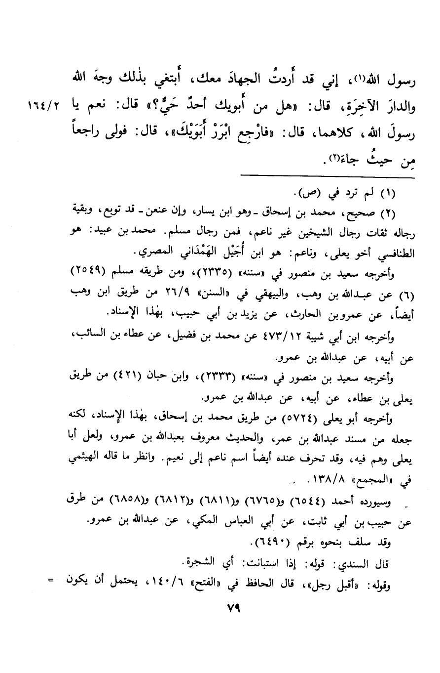 رَسُولَ اللهِ (١) ، إِنِّي قَدْ أَرَدْتُ الْجِهَادَ مَعَكَ، أَبْتَغِي بِذَلِكَ وَجْهَ اللهِ وَالدَّارَ الْآخِرَةَ، قَالَ: " هَلْ مِنْ أَبَوَيْكَ أَحَدٌ حَيٌّ؟ " قَالَ: نَعَمْ يَا رَسُولَ اللهِ، كِلَاهُمَا قَالَ: " فَارْجِعِ ابْرَرْ أَبَوَيْكَ " قَالَ: فَوَلَّى رَاجِعًا مِنْ حَيْثُ جَاءَ (٢)