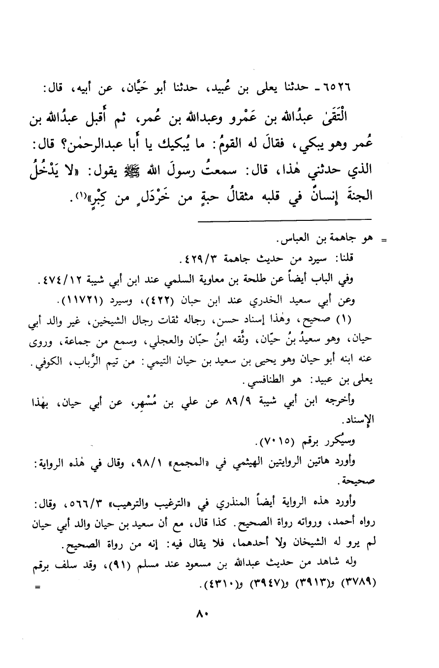 ٦٥٢٦ - حَدَّثَنَا يَعْلَى بْنُ عُبَيْدٍ، حَدَّثَنَا أَبُو حَيَّانَ، عَنْ أَبِيهِ، قَالَ: الْتَقَى عَبْدُ اللهِ بْنُ عَمْرٍو، وَعَبْدُ اللهِ بْنُ عُمَرَ ثُمَّ أَقْبَلَ عَبْدُ اللهِ بْنُ عُمَرَ وَهُوَ يَبْكِي، فَقَالَ لَهُ الْقَوْمُ: مَا يُبْكِيكَ يَا أَبَا عَبْدِ الرَّحْمَنِ؟ قَالَ: الَّذِي حَدَّثَنِي هَذَا، قَالَ: سَمِعْتُ رَسُولَ اللهِ صَلَّى اللهُ عَلَيْهِ وَسَلَّمَ يَقُولُ: " لَا يَدْخُلُ الْجَنَّةَ إِنْسَانٌ فِي قَلْبِهِ مِثْقَالُ حَبَّةٍ مِنْ خَرْدَلٍ مِنْ كِبْرٍ " (١)