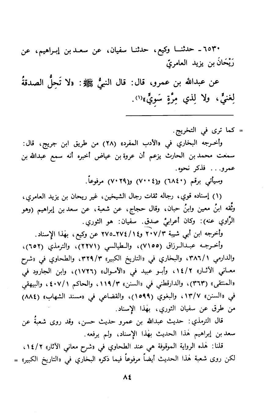 ٦٥٣٠ - حَدَّثَنَا وَكِيعٌ، حَدَّثَنَا سُفْيَانُ، عَنْ سَعْدِ بْنِ إِبْرَاهِيمَ، عَنْ رَيْحَانَ بْنِ يَزِيدَ الْعَامِرِيِّ، عَنْ عَبْدِ اللهِ بْنِ عَمْرٍو، قَالَ: قَالَ النَّبِيُّ صَلَّى اللهُ عَلَيْهِ وَسَلَّمَ: " لَا تَحِلُّ الصَّدَقَةُ لِغَنِيٍّ، وَلَا لِذِي مِرَّةٍ سَوِيٍّ " (١)