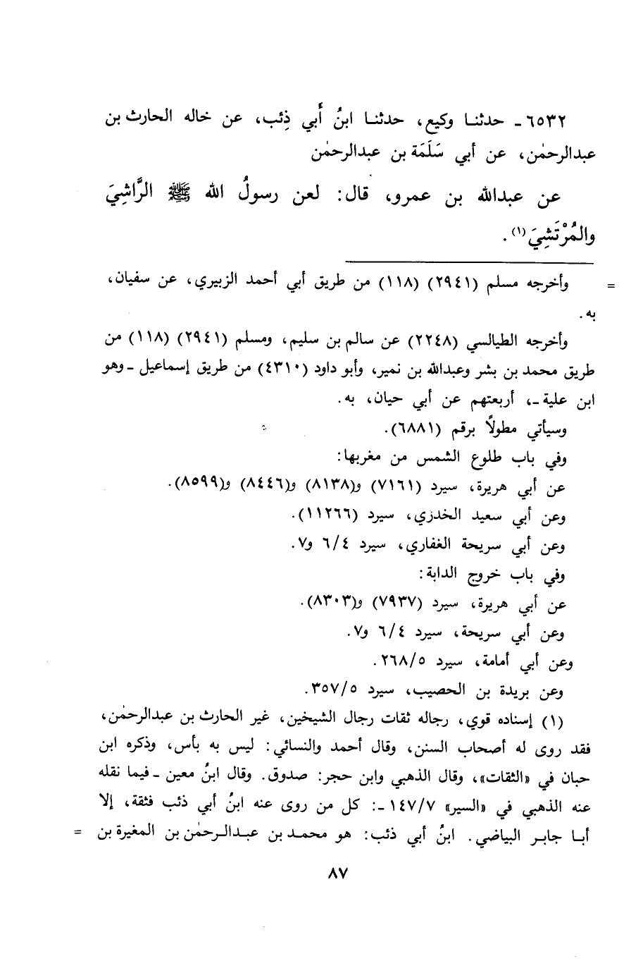 ٦٥٣٢ - حَدَّثَنَا وَكِيعٌ، حَدَّثَنَا ابْنُ أَبِي ذِئْبٍ، عَنْ خَالِهِ الْحَارِثِ بْنِ عَبْدِ الرَّحْمَنِ، عَنْ أَبِي سَلَمَةَ بْنِ عَبْدِ الرَّحْمَنِ، عَنْ عَبْدِ اللهِ بْنِ عَمْرٍو، قَالَ: " لَعَنَ رَسُولُ اللهِ صَلَّى اللهُ عَلَيْهِ وَسَلَّمَ الرَّاشِيَ وَالْمُرْتَشِيَ " (١)