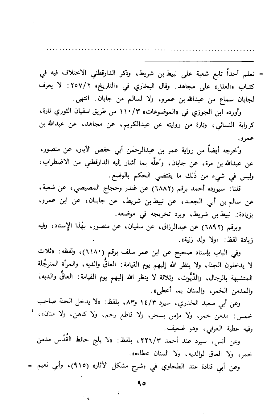 = نعلم أحداً تابع شعبة على نبيط بن شريط، وذكر الدارقطني الاختلاف فيه في كتاب "العلل" على مجاهد. وقال البخاري في "التاريخ" ٢/٢٥٧: لا يعرف لجابان سماع من عبد الله بن عمرو، ولا لسالم من جابان. انتهى.