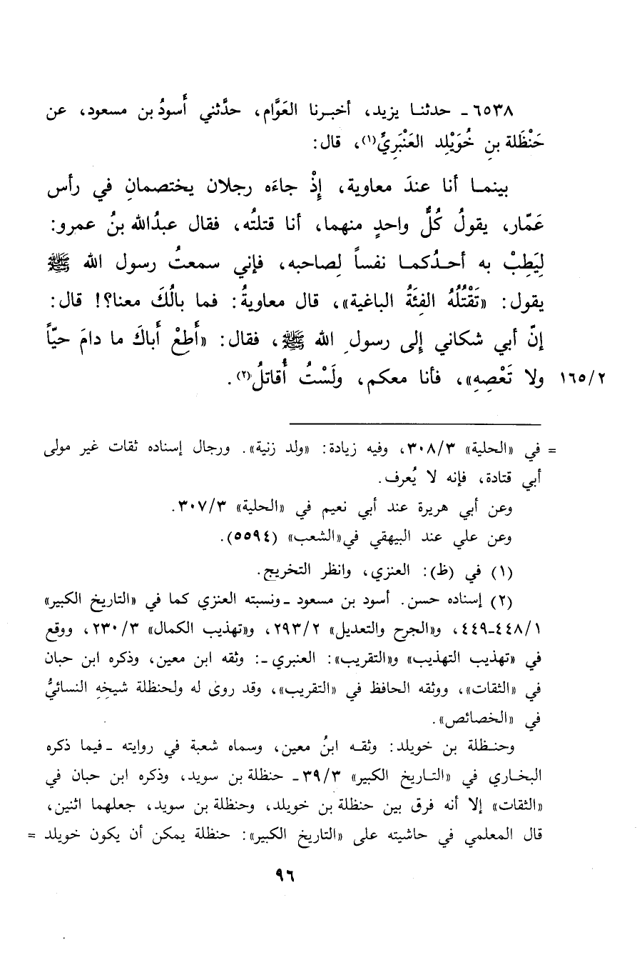 ٦٥٣٨ - حَدَّثَنَا يَزِيدُ، أَخْبَرَنَا الْعَوَّامُ، حَدَّثَنِي أَسْوَدُ بْنُ مَسْعُودٍ، عَنْ حَنْظَلَةَ بْنِ خُوَيْلِدٍ الْعَنْبرِيِّ (١) قَالَ: بَيْنَمَا أَنَا عِنْدَ مُعَاوِيَةَ، إِذْ جَاءَهُ رَجُلَانِ يَخْتَصِمَانِ فِي رَأْسِ عَمَّارٍ، يَقُولُ: كُلُّ وَاحِدٍ مِنْهُمَا أَنَا قَتَلْتُهُ، فَقَالَ عَبْدُ اللهِ بْنُ عَمْرٍو: لِيَطِبْ بِهِ أَحَدُكُمَا نَفْسًا لِصَاحِبِهِ، فَإِنِّي سَمِعْتُ رَسُولَ اللهِ صَلَّى اللهُ عَلَيْهِ وَسَلَّمَ يَقُولُ: " تَقْتُلُهُ الْفِئَةُ الْبَاغِيَةُ "، قَالَ مُعَاوِيَةُ: فَمَا بَالُكَ مَعَنَا؟ قَالَ: إِنَّ أَبِي شَكَانِي إِلَى رَسُولِ اللهِ صَلَّى اللهُ عَلَيْهِ وَسَلَّمَ فَقَالَ: " أَطِعْ أَبَاكَ مَا دَامَ حَيًّا، وَلَا تَعْصِهِ " فَأَنَا مَعَكُمْ وَلَسْتُ أُقَاتِلُ (٢)