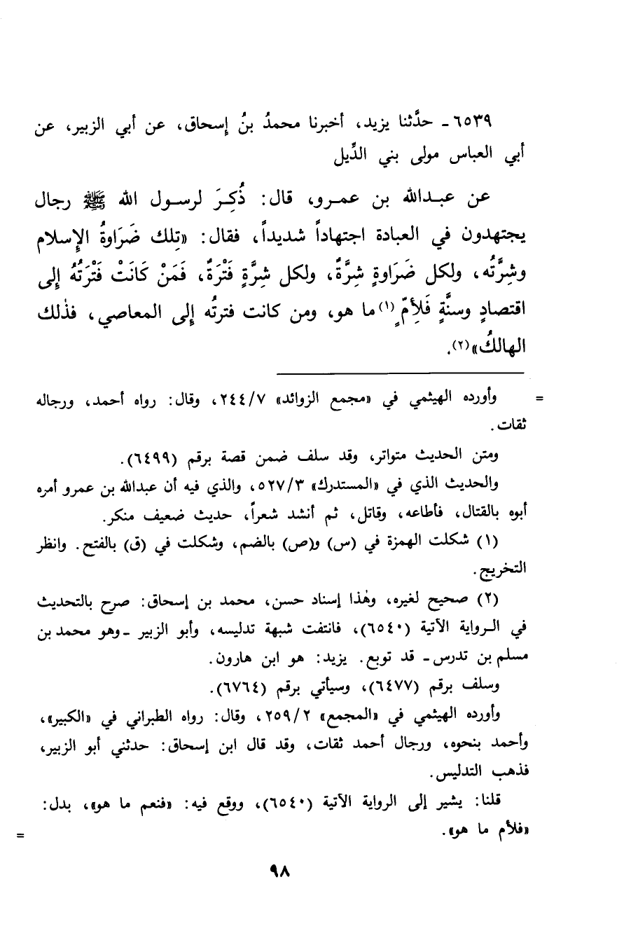 ٦٥٣٩ - حَدَّثَنَا يَزِيدُ، أَخْبَرَنَا مُحَمَّدُ بْنُ إِسْحَاقَ، عَنْ أَبِي الزُّبَيْرِ، عَنْ أَبِي الْعَبَّاسِ، مَوْلَى بَنِي الدِّيلِ، عَنْ عَبْدِ اللهِ بْنِ عَمْرٍو، قَالَ: ذُكِرَ لِرَسُولِ اللهِ صَلَّى اللهُ عَلَيْهِ وَسَلَّمَ رِجَالٌ يَجْتَهِدُونَ فِي الْعِبَادَةِ اجْتِهَادًا شَدِيدًا، فَقَالَ: " تِلْكَ ضَرَاوَةُ الْإِسْلَامِ وَشِرَّتُهُ، وَلِكُلِّ ضَرَاوَةٍ شِرَّةٌ، وَلِكُلِّ شِرَّةٍ فَتْرَةٌ، فَمَنْ كَانَتْ فَتْرَتُهُ إِلَى اقْتِصَادٍ وَسُنَّةٍ فَلِأُمٍّ (١) مَا هُوَ، وَمَنْ كَانَتْ فَتْرَتُهُ إِلَى الْمَعَاصِي، فَذَلِكَ الْهَالِكُ " (٢)