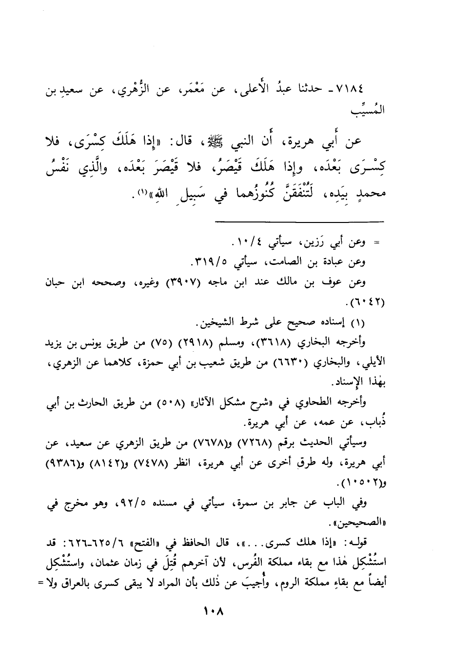 ٧١٨٤ - حَدَّثَنَا عَبْدُ الْأَعْلَى، عَنْ مَعْمَرٍ، عَنِ الزُّهْرِيِّ، عَنْ سَعِيدِ بْنِ الْمُسَيِّبِ، عَنْ أَبِي هُرَيْرَةَ، أَنَّ النَّبِيَّ صَلَّى اللهُ عَلَيْهِ وَسَلَّمَ قَالَ: " إِذَا هَلَكَ كِسْرَى، فَلَا كِسْرَى بَعْدَهُ، وَإِذَا هَلَكَ قَيْصَرُ، فَلَا قَيْصَرَ بَعْدَهُ، وَالَّذِي نَفْسُ مُحَمَّدٍ بِيَدِهِ، لَتُنْفِقُنَّ كُنُوزَهُمَا فِي سَبِيلِ اللهِ " (١)