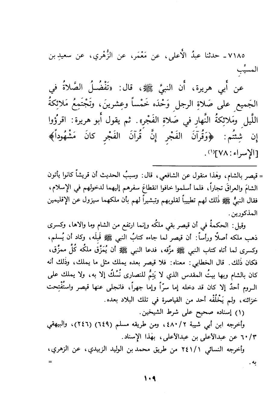 ٧١٨٥ - حَدَّثَنَا عَبْدُ الْأَعْلَى، عَنْ مَعْمَرٍ، عَنِ الزُّهْرِيِّ، عَنْ سَعِيدِ بْنِ الْمُسَيِّبِ، عَنْ أَبِي هُرَيْرَةَ، أَنَّ النَّبِيَّ صَلَّى اللهُ عَلَيْهِ وَسَلَّمَ قَالَ: " تَفْضُلُ الصَّلَاةُ فِي الْجَمِيعِ عَلَى صَلَاةِ الرَّجُلِ وَحْدَهُ خَمْسًا وَعِشْرِينَ، وَتَجْتَمِعُ مَلَائِكَةُ اللَّيْلِ وَمَلَائِكَةُ النَّهَارِ فِي صَلَاةِ الْفَجْرِ " ثُمَّ يَقُولُ أَبُو هُرَيْرَةَ: " اقْرَءُوا إِنْ شِئْتُمْ: {وَقُرْآنَ الْفَجْرِ إِنَّ قُرْآنَ الْفَجْرِ كَانَ مَشْهُودًا} [الإسراء: ٧٨] " (١)