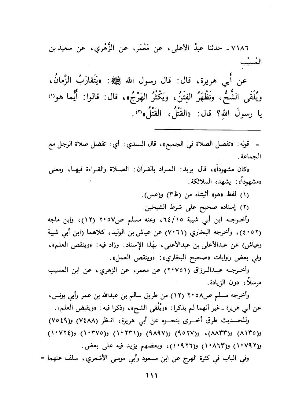 ٧١٨٦ - حَدَّثَنَا عَبْدُ الْأَعْلَى، عَنْ مَعْمَرٍ، عَنِ الزُّهْرِيِّ، عَنْ سَعِيدِ بْنِ الْمُسَيِّبِ، عَنْ أَبِي هُرَيْرَةَ، قَالَ: قَالَ رَسُولُ اللهِ صَلَّى اللهُ عَلَيْهِ وَسَلَّمَ: " يَتَقَارَبُ الزَّمَانُ، وَيُلْقَى الشُّحُّ، وَتَظْهَرُ الْفِتَنُ، وَيَكْثُرُ الْهَرْجُ "، قَالَ: قَالُوا: أَيُّمَا هُوَ (١) يَا رَسُولَ اللهِ؟ قَالَ: " الْقَتْلُ، الْقَتْلُ " (٢)