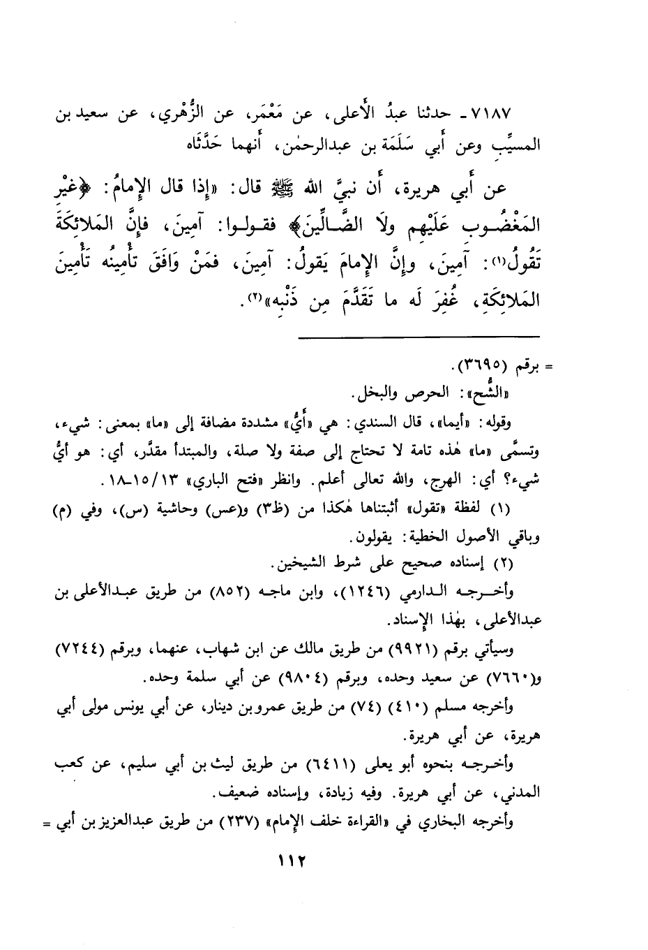 ٧١٨٧ - حَدَّثَنَا عَبْدُ الْأَعْلَى، عَنْ مَعْمَرٍ، عَنِ الزُّهْرِيِّ، عَنْ سَعِيدِ بْنِ الْمُسَيِّبِ، وَعَنْ أَبِي سَلَمَةَ بْنِ عَبْدِ الرَّحْمَنِ، أَنَّهُمَا حَدَّثَاهُ، عَنْ أَبِي هُرَيْرَةَ، أَنَّ نَبِيَّ اللهِ صَلَّى اللهُ عَلَيْهِ وَسَلَّمَ قَالَ: " إِذَا قَالَ الْإِمَامُ: {غَيْرِ الْمَغْضُوبِ عَلَيْهِمْ وَلَا الضَّالِّينَ} [الفاتحة: ٧] ، فَقُولُوا: آمِينَ، فَإِنَّ الْمَلَائِكَةَ تَقُولُ (١) : آمِينَ، وَإِنَّ الْإِمَامَ يَقُولُ: آمِينَ، فَمَنْ وَافَقَ تَأْمِينُهُ تَأْمِينَ الْمَلَائِكَةِ، غُفِرَ لَهُ مَا تَقَدَّمَ مِنْ ذَنْبِهِ " (٢)
