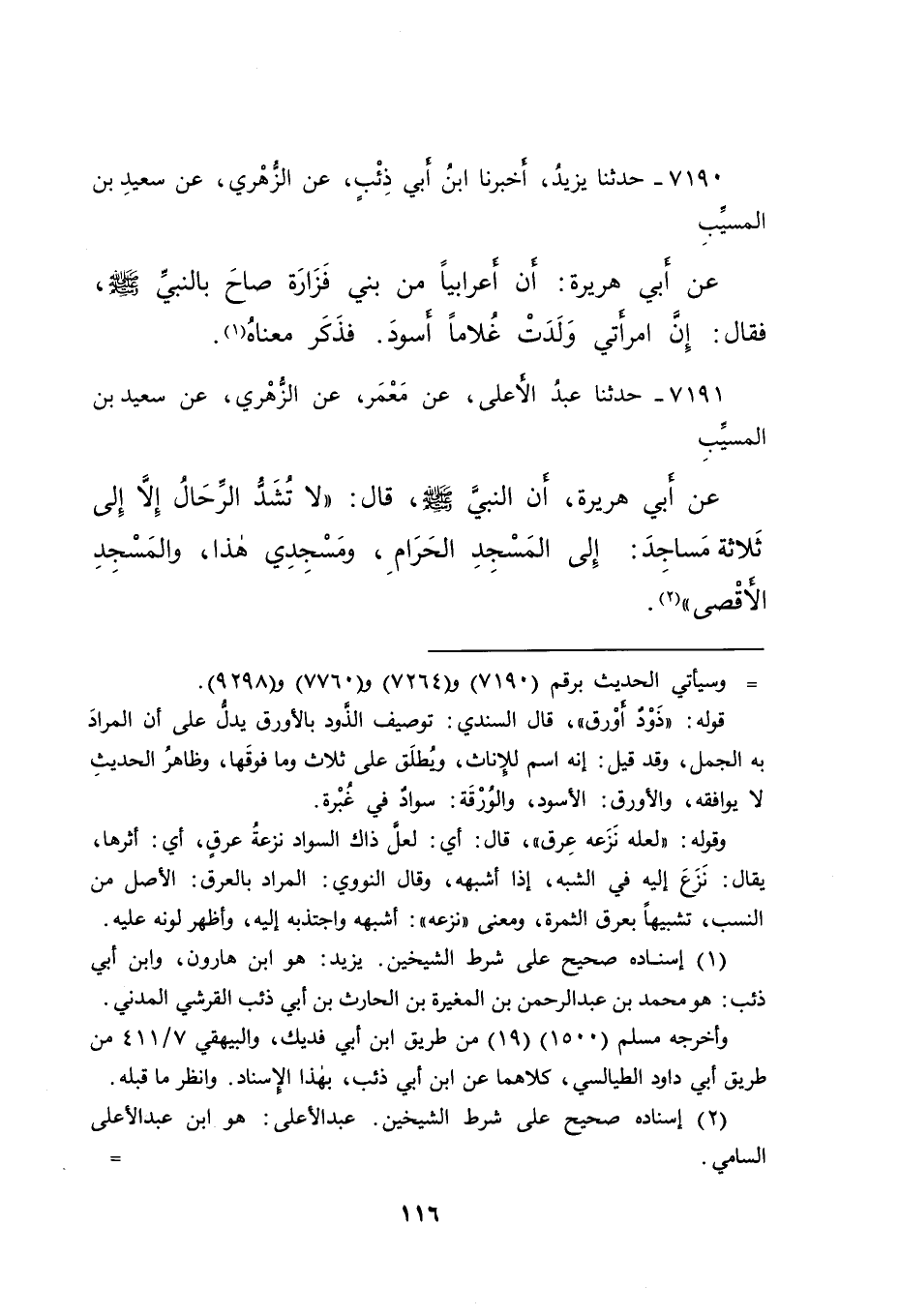 ٧١٩١ - حَدَّثَنَا عَبْدُ الْأَعْلَى، عَنْ مَعْمَرٍ، عَنِ الزُّهْرِيِّ، عَنْ سَعِيدِ بْنِ الْمُسَيِّبِ، عَنْ أَبِي هُرَيْرَةَ، أَنَّ النَّبِيَّ صَلَّى اللهُ عَلَيْهِ وَسَلَّمَ قَالَ: " لَا تُشَدُّ الرِّحَالُ إِلَّا إِلَى ثَلَاثِ مَسَاجِدَ: إِلَى الْمَسْجِدِ الْحَرَامِ، وَمَسْجِدِي هَذَا، وَالْمَسْجِدِ الْأَقْصَى " (٢)