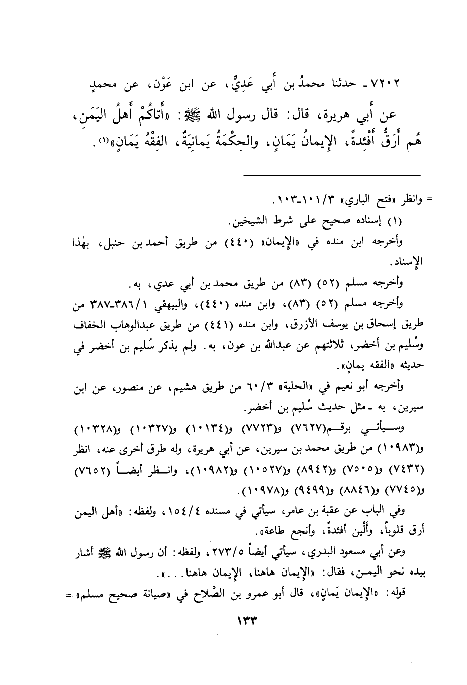 ٧٢٠٢ - حَدَّثَنَا مُحَمَّدُ بْنُ أَبِي عَدِيٍّ، عَنِ ابْنِ عَوْنٍ، عَنْ مُحَمَّدٍ، عَنْ أَبِي هُرَيْرَةَ، قَالَ: قَالَ رَسُولُ اللهِ صَلَّى اللهُ عَلَيْهِ وَسَلَّمَ: " أَتَاكُمْ أَهْلُ الْيَمَنِ، هُمْ أَرَقُّ أَفْئِدَةً، الْإِيمَانُ يَمَانٍ، وَالْحِكْمَةُ يَمَانِيَةٌ، وَالْفِقْهُ يَمَانٍ " (١)