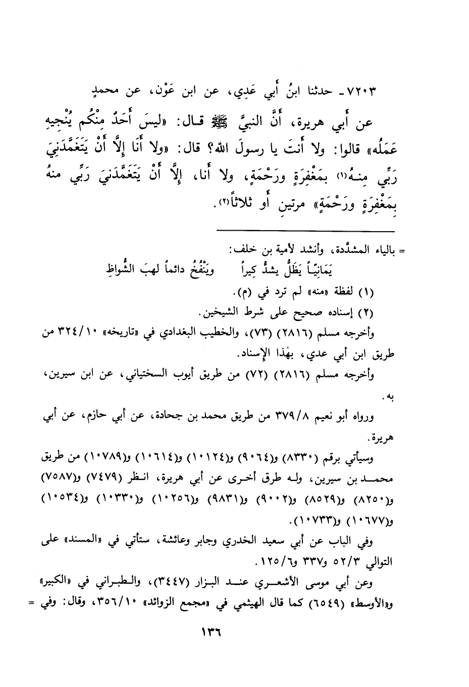 ٧٢٠٣ - حَدَّثَنَا ابْنُ أَبِي عَدِيٍّ، عَنِ ابْنِ عَوْنٍ، عَنْ مُحَمَّدٍ، عَنْ أَبِي هُرَيْرَةَ، أَنَّ النَّبِيَّ صَلَّى اللهُ عَلَيْهِ وَسَلَّمَ قَالَ: " لَيْسَ أَحَدٌ مِنْكُمْ يُنَجِّيهِ عَمَلهُ " قَالُوا: وَلَا أَنْتَ يَا رَسُولَ اللهِ؟ قَالَ: " وَلَا أَنَا إِلَّا أَنْ يَتَغَمَّدَنِي رَبِّي مِنْهُ (١) بِمَغْفِرَةٍ وَرَحْمَةٍ، وَلَا أَنَا، إِلَّا أَنْ يَتَغَمَّدَنِي رَبِّي مِنْهُ بِمَغْفِرَةٍ وَرَحْمَةٍ " مَرَّتَيْنِ أَوْ ثَلَاثًا (٢)
