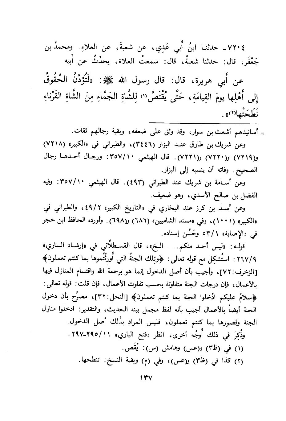 ٧٢٠٤ - حَدَّثَنَا ابْنُ أَبِي عَدِيٍّ، عَنْ شُعْبَةَ، عَنِ الْعَلَاءِ، وَمُحَمَّدُ بْنُ جَعْفَرٍ، قَالَ: حَدَّثَنَا شُعْبَةُ، قَالَ: سَمِعْتُ الْعَلَاءَ، يُحَدِّثُ، عَنْ أَبِيهِ، عَنْ أَبِي هُرَيْرَةَ، قَالَ: قَالَ رَسُولُ اللهِ صَلَّى اللهُ عَلَيْهِ وَسَلَّمَ: " لَتُؤَدُّنَّ الْحُقُوقَ إِلَى أَهْلِهَا يَوْمَ الْقِيَامَةِ، حَتَّى يُقْتَصَّ (١) لِلشَّاةِ الْجَمَّاءِ مِنَ الشَّاةِ الْقَرْنَاءِ نَطَحَتْهَا " (٢)