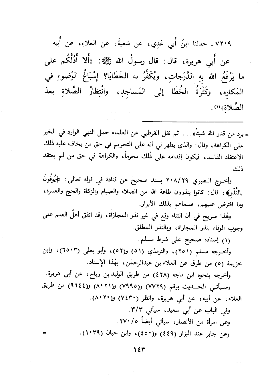 ٧٢٠٩ - حَدَّثَنَا ابْنُ أَبِي عَدِيٍّ، عَنْ شُعْبَةَ، عَنِ الْعَلَاءِ، عَنْ أَبِيهِ، عَنْ أَبِي هُرَيْرَةَ، قَالَ: قَالَ رَسُولُ اللهِ صَلَّى اللهُ عَلَيْهِ وَسَلَّمَ: " أَلَا أَدُلُّكُمْ عَلَى مَا يَرْفَعُ اللهُ بِهِ الدَّرَجَاتِ، وَيُكَفِّرُ بِهِ الْخَطَايَا؟ إِسْبَاغُ الْوُضُوءِ فِي الْمَكَارِهِ، وَكَثْرَةُ الْخُطَا إِلَى الْمَسَاجِدِ، وَانْتِظَارُ الصَّلَاةِ بَعْدَ الصَّلَاةِ " (١)