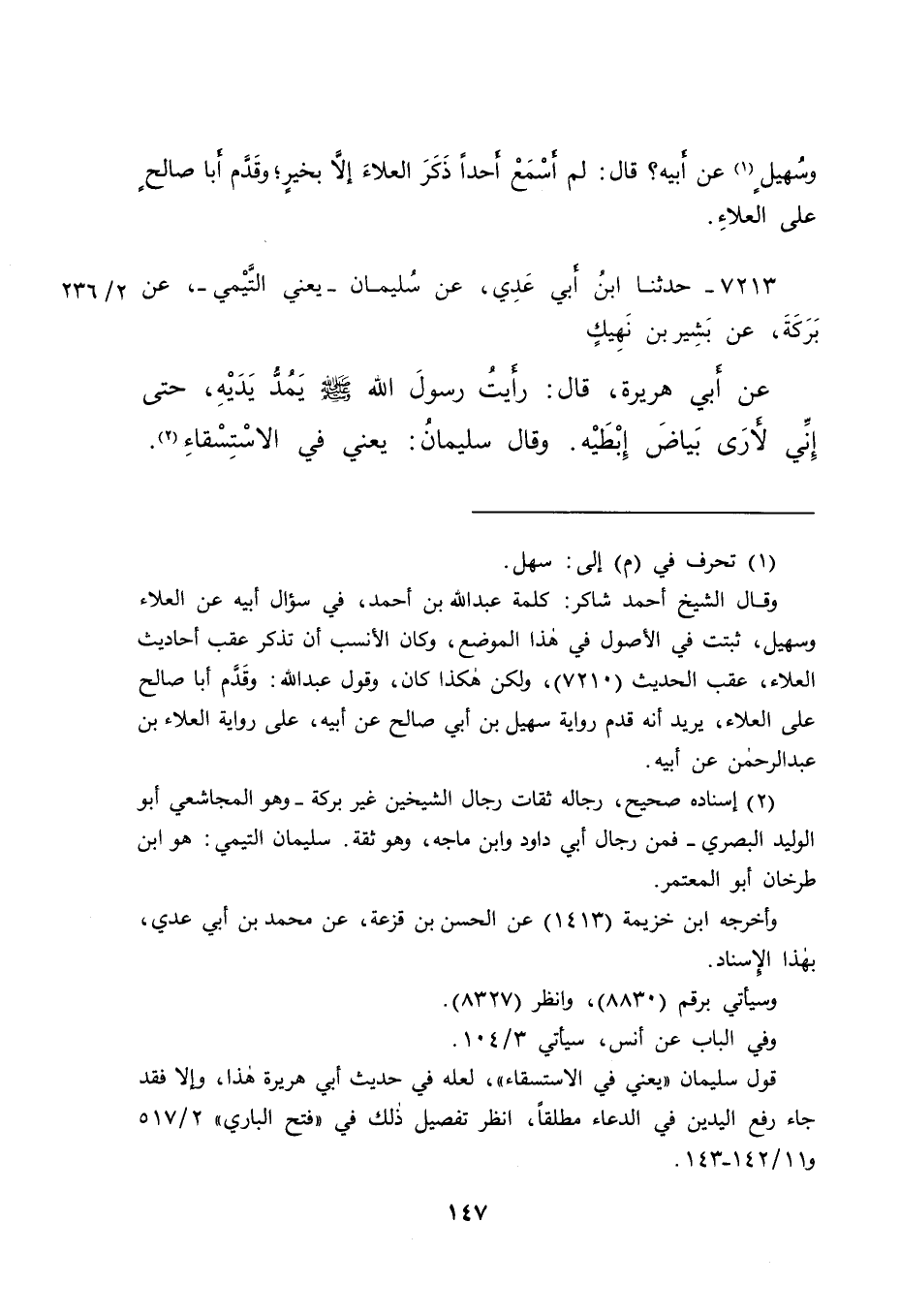 وقال الشيخ أحمد شاكر: كلمة عبد الله بن أحمد، في سؤال أبيه عن العلاء وسهيل، ثبتت في الأصول في هذا الموضع، وكان الأنسب أن تذكر عقب أحاديث العلاء، عقب الحديث (٧٢١٠) ، ولكن هكذا كان، وقول عبد الله: وقدَّم أبا صالح على العلاء، يريد أنه قدم رواية سهيل بن أبي صالح عن أبيه، على رواية العلاء بن عبد الرحمن عن أبيه.