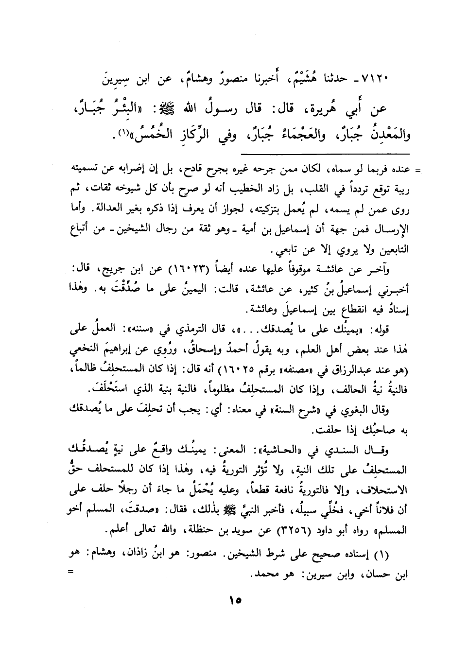 ٧١٢٠ - حَدَّثَنَا هُشَيْمٌ، أَخْبَرَنَا مَنْصُورٌ، وَهِشَامٌ، عَنْ ابْنِ سِيرِينَ، عَنْ أَبِي هُرَيْرَةَ، قَالَ: قَالَ رَسُولُ اللهِ صَلَّى اللهُ عَلَيْهِ وَسَلَّمَ: " الْبِئْرُ جُبَارٌ، وَالْمَعْدِنُ جُبَارٌ، وَالْعَجْمَاءُ جُبَارٌ، وَفِي الرِّكَازِ الْخُمُسُ " (١)