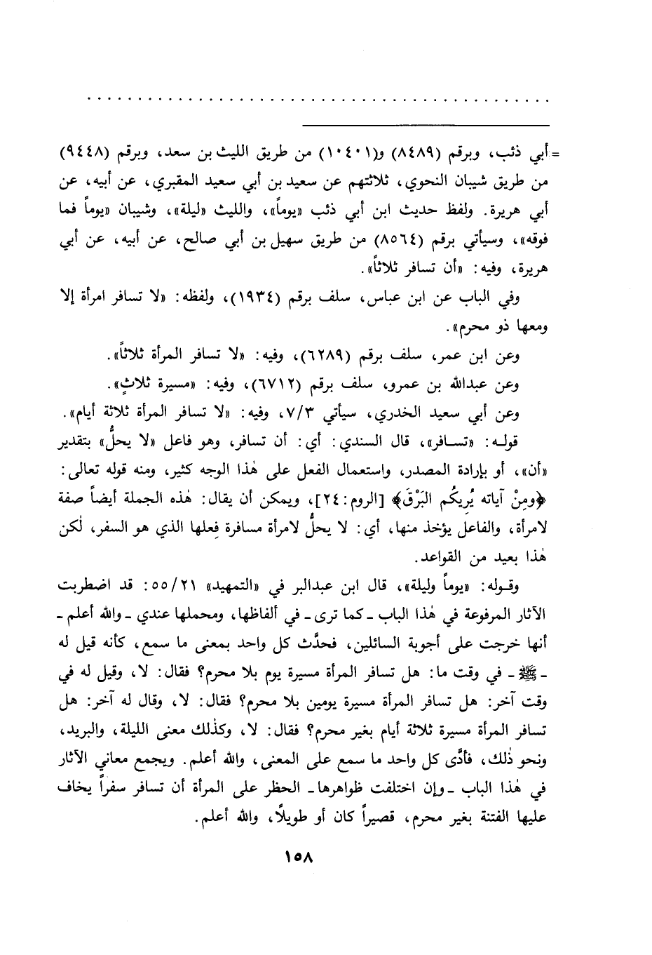 وعن أبي سعيد الخدري، سيأتي ٣/٧، وفيه: "لا تسافر المرأة ثلاثة أيام" قوله: "تسافر"، قال السندي: أي: أن تسافر، وهو فاعل "لا يحل" بتقدير "أن"، أو بإرادة المصدر، واستعمال الفعل على هذا الوجه كثير، ومنه قوله تعالى: (ومن آياته يريكم البرق) [الروم: ٢٤] ، ويمكن أن يقال: هذه الجملة أيضا صفة لامرأة، والفاعل يؤخذ منها، أي: لا يحل لامرأة مسافرة فعلها الذي هو السفر، لكن