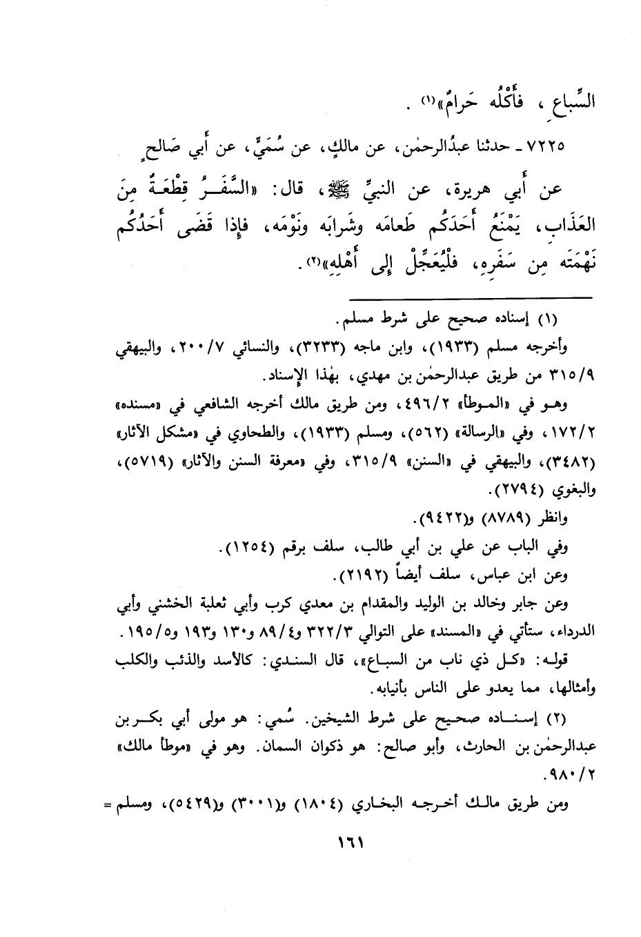 ٧٢٢٥ - حَدَّثَنَا عَبْدُ الرَّحْمَنِ، عَنْ مَالِكٍ، عَنْ سُمَيٍّ، عَنْ أَبِي صَالِحٍ، عَنْ أَبِي هُرَيْرَةَ، عَنِ النَّبِيِّ صَلَّى اللهُ عَلَيْهِ وَسَلَّمَ قَالَ: " السَّفَرُ قِطْعَةٌ مِنَ الْعَذَابِ، يَمْنَعُ أَحَدَكُمْ طَعَامَهُ وَشَرَابَهُ وَنَوْمَهُ، فَإِذَا قَضَى أَحَدُكُمْ نَهْمَتَهُ مِنْ سَفَرِهِ، فَلْيُعَجِّلْ إِلَى أَهْلِهِ " (٢)