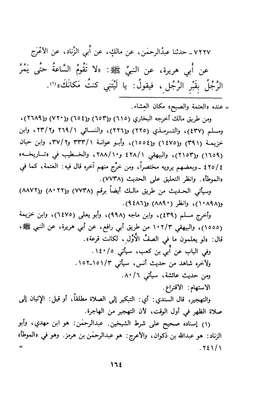 ٧٢٢٧ - حَدَّثَنَا عَبْدُ الرَّحْمَنِ، عَنْ مَالِكٍ، عَنْ أَبِي الزِّنَادِ، عَنِ الْأَعْرَجِ، عَنْ أَبِي هُرَيْرَةَ، عَنِ النَّبِيِّ صَلَّى اللهُ عَلَيْهِ وَسَلَّمَ: " لَا تَقُومُ السَّاعَةُ حَتَّى يَمُرَّ الرَّجُلُ بِقَبْرِ الرَّجُلِ، فَيَقُولَ: يَا لَيْتَنِي كُنْتُ مَكَانَكَ " (١)