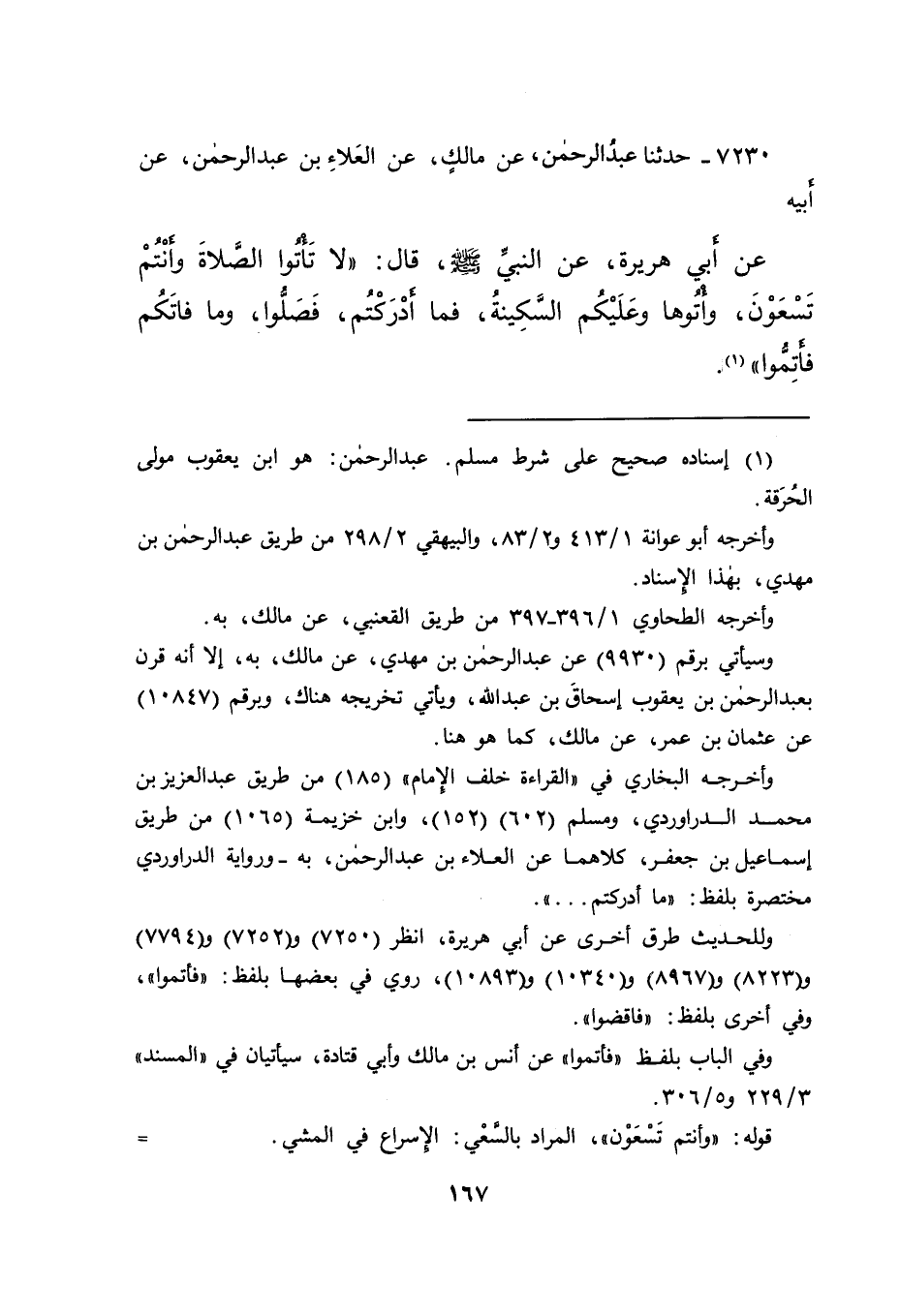 ٧٢٣٠ - حَدَّثَنَا عَبْدُ الرَّحْمَنِ، عَنْ مَالِكٍ، عَنِ الْعَلَاءِ بْنِ عَبْدِ الرَّحْمَنِ، عَنْ أَبِيهِ، عَنْ أَبِي هُرَيْرَةَ، عَنِ النَّبِيِّ صَلَّى اللهُ عَلَيْهِ وَسَلَّمَ قَالَ: " لَا تَأْتُوا الصَّلَاةَ وَأَنْتُمْ تَسْعَوْنَ، وَأْتُوهَا وَعَلَيْكُمُ السَّكِينَةُ، فَمَا أَدْرَكْتُمْ، فَصَلُّوا، وَمَا فَاتَكُمْ فَأَتِمُّوا " (١)