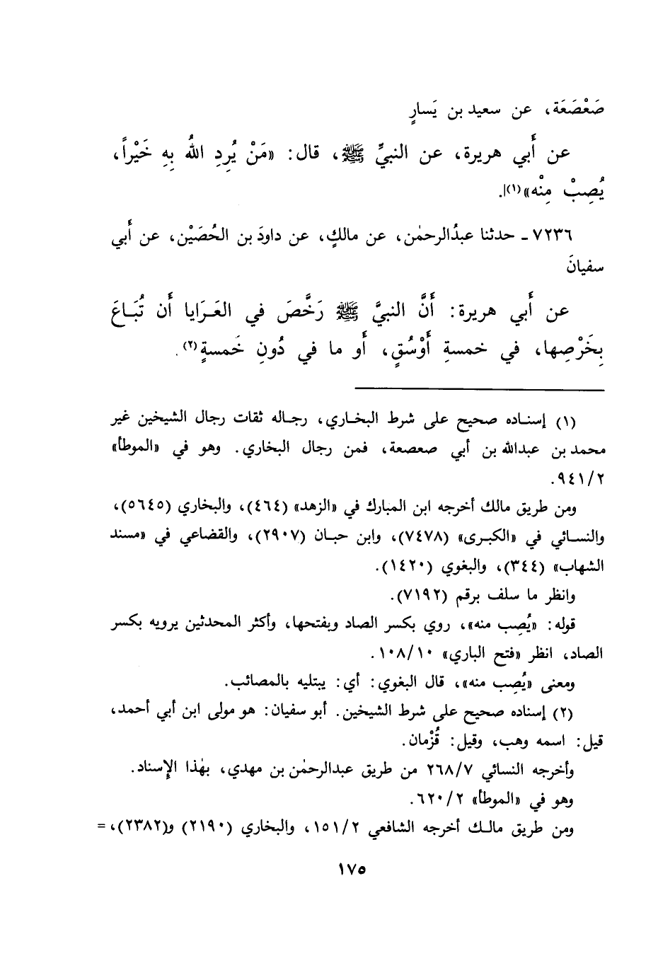 صَعْصَعَةَ، عَنْ سَعِيدِ بْنِ يَسَارٍ، عَنْ أَبِي هُرَيْرَةَ، عَنِ النَّبِيِّ صَلَّى اللهُ عَلَيْهِ وَسَلَّمَ قَالَ: " مَنْ يُرِدِ اللهُ بِهِ خَيْرًا يُصِبْ مِنْهُ " (١)