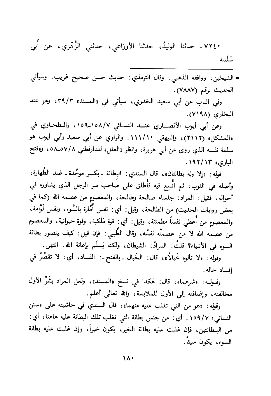 ٧٢٤٠ - حَدَّثَنَا الْوَلِيدُ، حَدَّثَنَا الْأَوْزَاعِيُّ، حَدَّثَنِي الزُّهْرِيُّ، عَنْ أَبِي سَلَمَةَ،