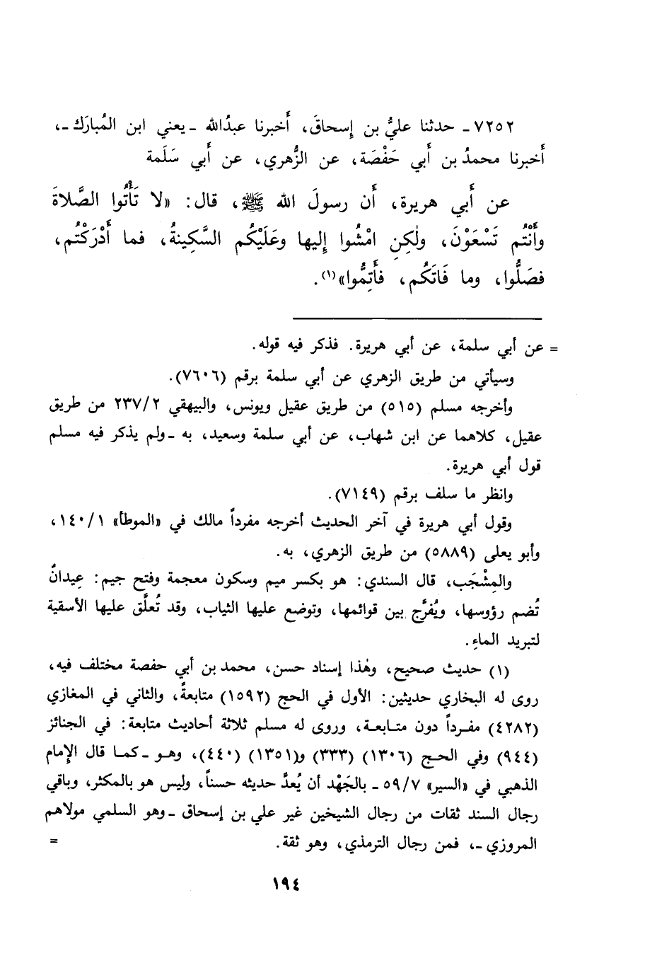٧٢٥٢ - حَدَّثَنَا عَلِيُّ بْنُ إِسْحَاقَ، أَخْبَرَنَا عَبْدُ اللهِ يَعْنِي ابْنَ الْمُبَارَكِ، أَخْبَرَنَا مُحَمَّدُ بْنُ أَبِي حَفْصَةَ، عَنِ الزُّهْرِيِّ، عَنْ أَبِي سَلَمَةَ، عَنْ أَبِي هُرَيْرَةَ، أَنَّ رَسُولَ اللهِ صَلَّى اللهُ عَلَيْهِ وَسَلَّمَ قَالَ: " لَا تَأْتُوا الصَّلَاةَ وَأَنْتُمْ تَسْعَوْنَ، وَلَكِنِ امْشُوا إِلَيْهَا وَعَلَيْكُمُ السَّكِينَةُ، فَمَا أَدْرَكْتُمْ، فَصَلُّوا، وَمَا فَاتَكُمْ، فَأَتِمُّوا " (١)