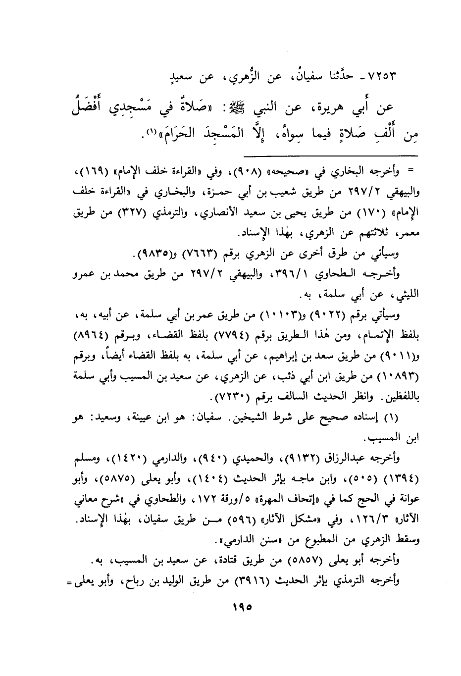 ٧٢٥٣ - حَدَّثَنَا سُفْيَانُ، عَنِ الزُّهْرِيِّ، عَنْ سَعِيدٍ، عَنْ أَبِي هُرَيْرَةَ، عَنِ النَّبِيِّ صَلَّى اللهُ عَلَيْهِ وَسَلَّمَ: " صَلَاةٌ فِي مَسْجِدِي أَفْضَلُ مِنْ أَلْفِ صَلَاةٍ فِيمَا سِوَاهُ، إِلَّا الْمَسْجِدَ الْحَرَامَ " (١)