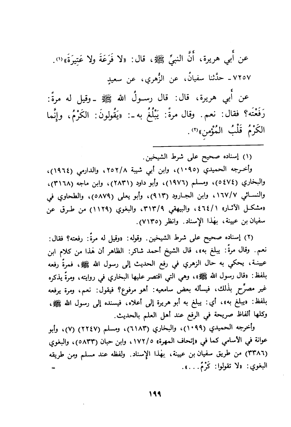 ٧٢٥٧ - حَدَّثَنَا سُفْيَانُ، عَنِ الزُّهْرِيِّ، عَنْ سَعِيدٍ، عَنْ أَبِي هُرَيْرَةَ، قَالَ: قَالَ رَسُولُ اللهِ صَلَّى اللهُ عَلَيْهِ وَسَلَّمَ - وَقِيلَ لَهُ مَرَّةً: رَفَعْتَهُ؟ فَقَالَ: نَعَمْ. وَقَالَ مَرَّةً: يَبْلُغُ بِهِ -: " يَقُولُونَ: الْكَرْمُ، وَإِنَّمَا الْكَرْمُ قَلْبُ الْمُؤْمِنِ " (٢)