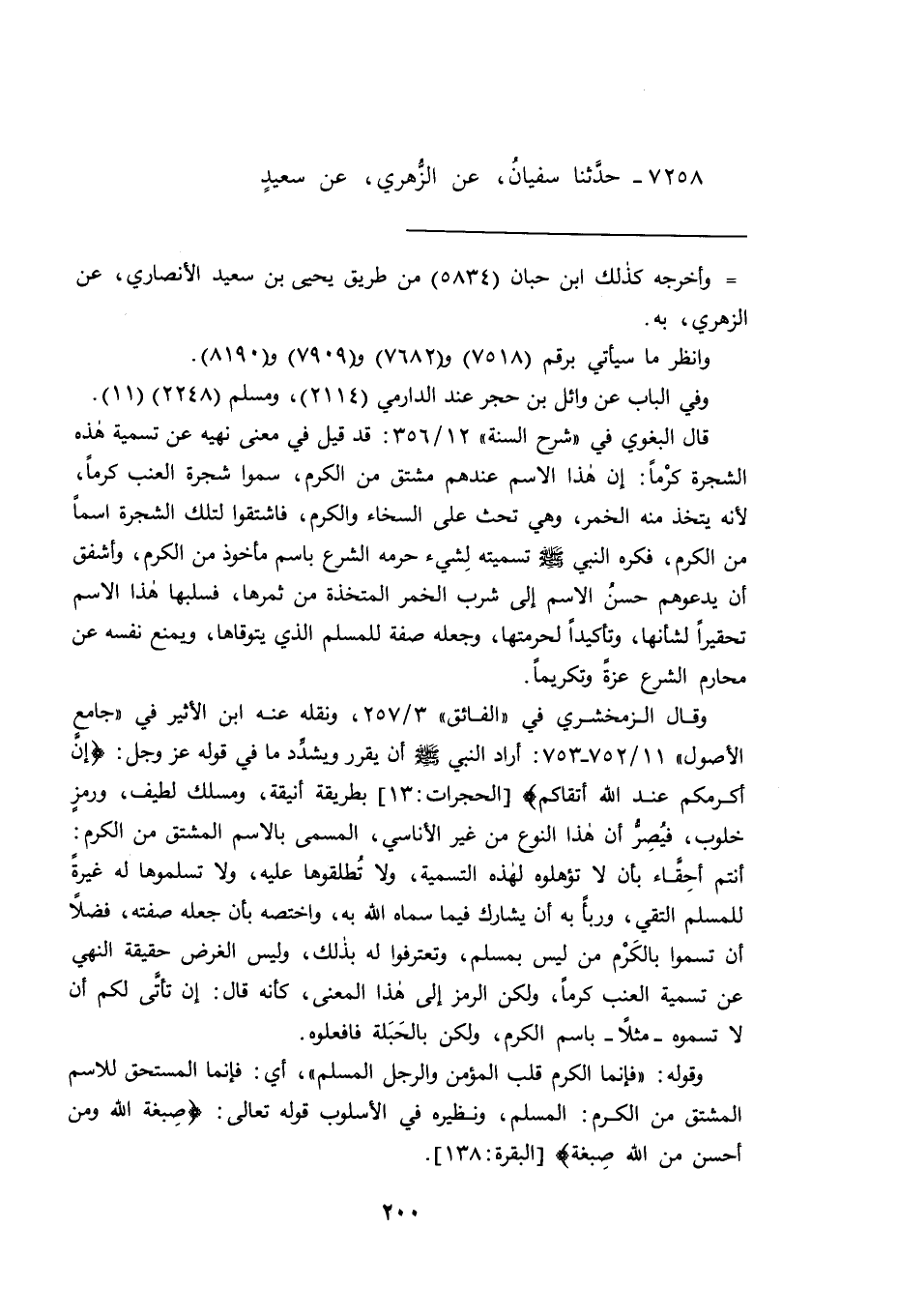 وقال الزمخشري في "الفائق" ٣/٢٥٧، ونقله عنه ابن الأثير في "جامع الأصول" ١١/٧٥٢-٧٥٣: أراد النبي صَلَّى اللهُ عَلَيْهِ وَسَلَّمَ أن يقرر ويشدد ما في قوله عز وجل: (إن أكرمكم عند الله أتقاكم) [الحجرات:١٣] بطريقة أنيقة، ومسلك لطيف، ورمز خلوب، فيصر أن هذا النوع من غير الأناسي، المسمى بالاسم المشتق من الكرم: أنتم أحقاء بأن لا تؤهلوه لهذه التسمية، ولا تطلقوها عليه، ولا تسلموها له غيرة للمسلم التقي، وربأ به أن يشارك فيما سماه الله به، واختصه بأن جعله صفته، فضلا أن تسم بالكرم من ليس بمسلم، وتعترفوا له بذلك، وليس الغرض حقيقة النهي عن تسمية العنب كرما، ولكن الرمز إلى هذا المعنى، كأنه قال: إن تأتى لكم أن لا تسموه -مثلا- باسم الكرم، ولكن بالحبلة فافعلوه.
