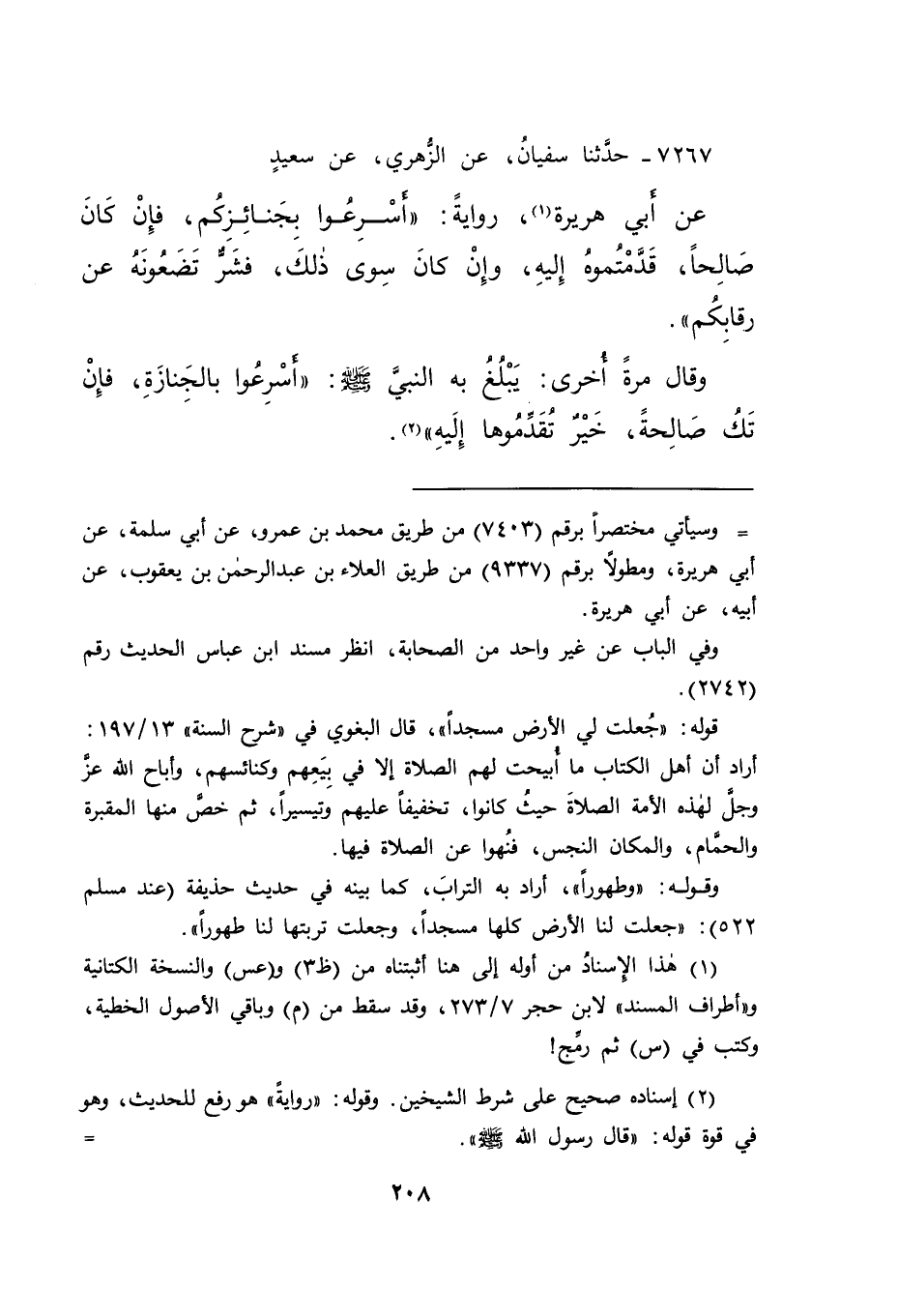 ٧٢٦٧ - حَدَّثَنَا سُفْيَانُ، عَنِ الزُّهْرِيِّ، عَنْ سَعِيدٍ، عَنْ أَبِي هُرَيْرَةَ (١) ، رِوَايَةً: " أَسْرِعُوا بِجَنَائِزِكُمْ، فَإِنْ كَانَ صَالِحًا، قَدَّمْتُمُوهُ إِلَيْهِ، وَإِنْ كَانَ سِوَى ذَلِكَ، فَشَرٌّ تَضَعُونَهُ عَنْ رِقَابِكُمْ " وَقَالَ مَرَّةً أُخْرَى: يَبْلُغُ بِهِ النَّبِيَّ صَلَّى اللهُ عَلَيْهِ وَسَلَّمَ: " أَسْرِعُوا بِالْجِنَازَةِ، فَإِنْ تَكُ صَالِحَةً، خَيْرٌ تُقَدِّمُوهَا إِلَيْهِ " (٢)