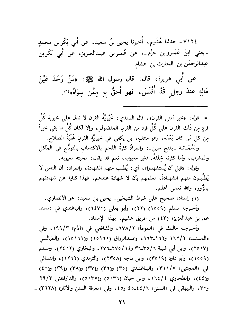 ٧١٢٤ - حَدَّثَنَا هُشَيْمٌ، أَخْبَرَنَا يَحْيَى بْنُ سَعِيدٍ، عَنْ أَبِي بَكْرِ بْنِ مُحَمَّدٍ يَعْنِي ابْنَ عَمْرِو بْنِ حَزْمٍ، عَنْ عُمَرَ بْنِ عَبْدِ الْعَزِيزِ، عَنْ أَبِي بَكْرِ بْنِ عَبْدِ الرَّحْمَنِ بْنِ الْحَارِثِ بْنِ هِشَامٍ، عَنْ أَبِي هُرَيْرَةَ، قَالَ: قَالَ رَسُولُ اللهِ صَلَّى اللهُ عَلَيْهِ وَسَلَّمَ: " مَنْ وَجَدَ عَيْنَ مَالِهِ عِنْدَ رَجُلٍ قَدْ أَفْلَسَ، فَهُوَ أَحَقُّ بِهِ مِمَّنْ سِوَاهُ " (١)