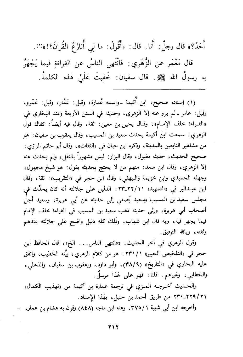 وقول الزهري في آخر الحديث: "فانتهى الناس ... الخ"، قال الحافظ ابن حجر في "التلخيص الحبير" ١/٢٣١: هو من كلام الزهري، بينه الخطيب، واتفق عليه البخاري في "التاريخ" (٩/٣٨) ، وأبو داود، ويعقوب بن سفيان، والذهلي، والخطابي، وغيرهم. قلنا: فهو على هذا مرسل.
