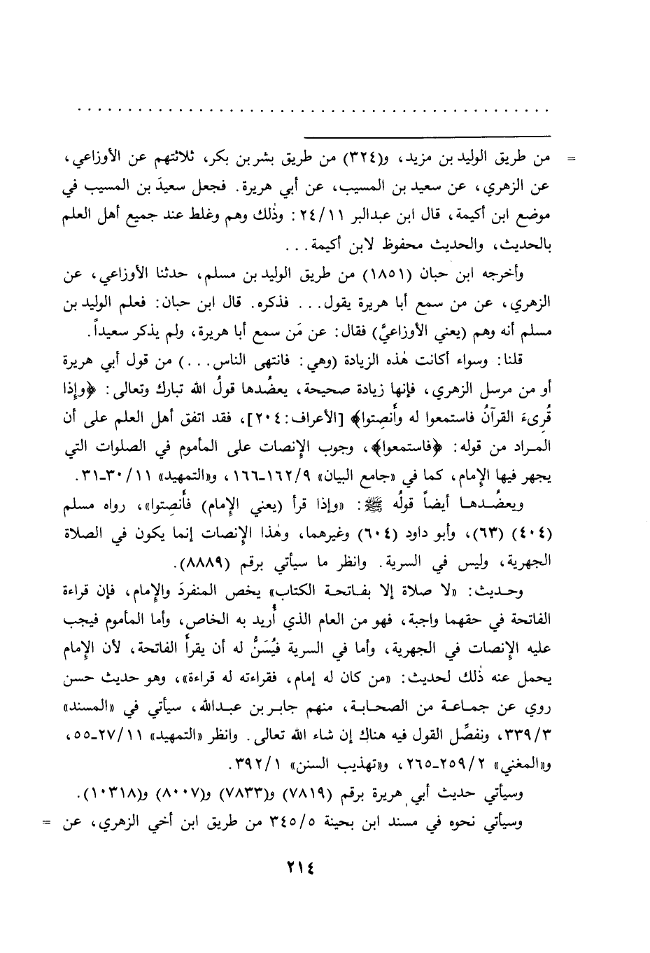 قلنا: وسواء أكانت هذه الزيادة (وهي: فانتهى الناس ... ) من قول أبي هريرة أو من مرسل الزهري، فإنها زيادة صحيحة، يعضدها قول الله تبارك وتعالى: (وإذا قرىء القرآن فاستمعوا له وأنصتوا) [الأعراف: ٢٠٤] ، فقد اتفق أهل العلم على أن المراد من قوله: (فاستمعوا) ، وجوب الإنصات على المأموم في الصلوات التي يجهر فيها الإمام، كما في "جامع البيان" ٩/١٦٢-١٦٦، و"التمهيد" ١١/٣٠-٣١.