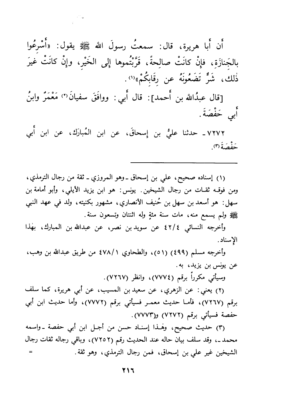 ٧٢٧٢ - حَدَّثَنَا عَلِيُّ بْنُ إِسْحَاقَ، عَنِ ابْنِ الْمُبَارَكِ، عَنِ ابْنِ أَبِي حَفْصَةَ (٣)