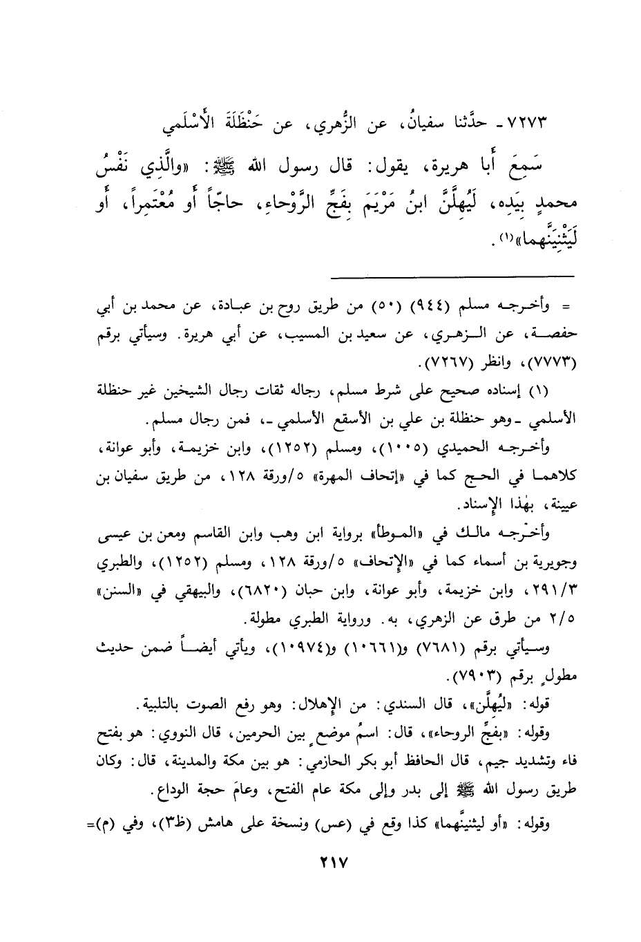 ٧٢٧٣ - حَدَّثَنَا سُفْيَانُ، عَنِ الزُّهْرِيِّ، عَنْ حَنْظَلَةَ الْأَسْلَمِيِّ، سَمِعَ أَبَا هُرَيْرَةَ، يَقُولُ: قَالَ رَسُولُ اللهِ صَلَّى اللهُ عَلَيْهِ وَسَلَّمَ: " وَالَّذِي نَفْسُ مُحَمَّدٍ بِيَدِهِ، لَيُهِلَّنَّ ابْنُ مَرْيَمَ بِفَجِّ الرَّوْحَاءِ، حَاجًّا أَوْ مُعْتَمِرًا، أَوْ لَيَثْنِيَنَّهُمَا " (١)