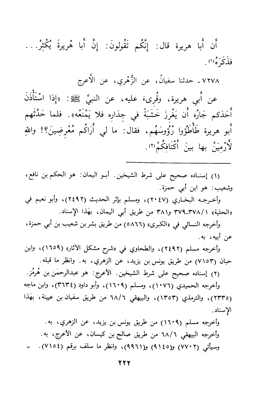 ٧٢٧٨ - حَدَّثَنَا سُفْيَانُ، عَنِ الزُّهْرِيِّ، عَنِ الْأَعْرَجِ، عَنْ أَبِي هُرَيْرَةَ، وَقُرِئَ عَلَيْهِ، عَنِ النَّبِيِّ صَلَّى اللهُ عَلَيْهِ وَسَلَّمَ: " إِذَا اسْتَأْذَنَ أَحَدَكُمْ جَارُهُ أَنْ يَغْرِزَ خَشَبَةً فِي جِدَارِهِ فَلَا يَمْنَعْهُ " فَلَمَّا حَدَّثَهُمْ أَبُو هُرَيْرَةَ، طَأْطَئُوا رُءُوسَهُمْ، فَقَالَ: " مَا لِي أَرَاكُمْ مُعْرِضِينَ؟ وَاللهِ لَأَرْمِيَنَّ بِهَا بَيْنَ أَكْتَافِكُمْ " (٢)